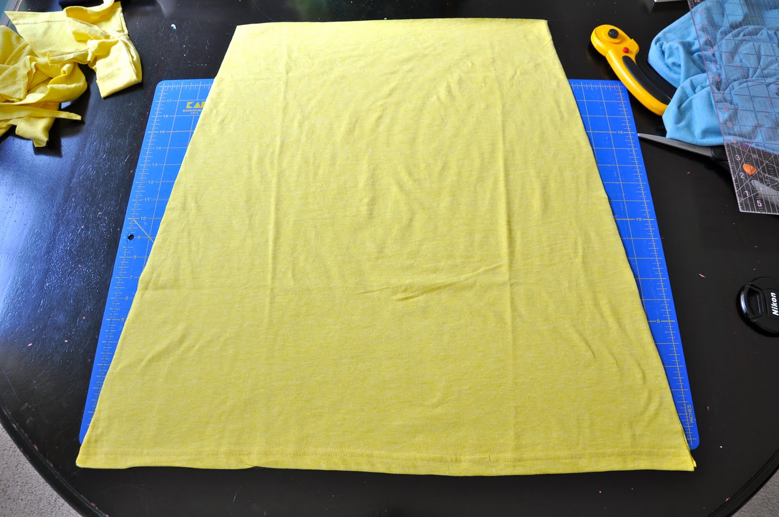 start by laying your shirt out flat on cutting mat…i lined my cutting guide up on the top of each sleeve…and cut to get a nice parallel (to the bottom hem) line…