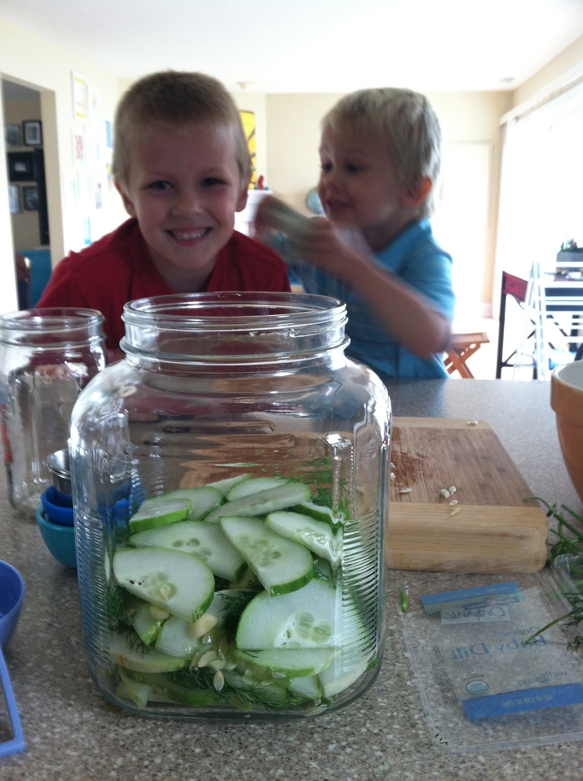 My friend Joanna gave Moses this 2lb pickle the other day and I thought that now was the time we tried it! Moses was psyched! This was a perfect opportunity to let him help measure and talk with him about how many different foods we can grow ourselves. He loved every minute of it…include the eating part. The pickles tasted delicious and fresh!