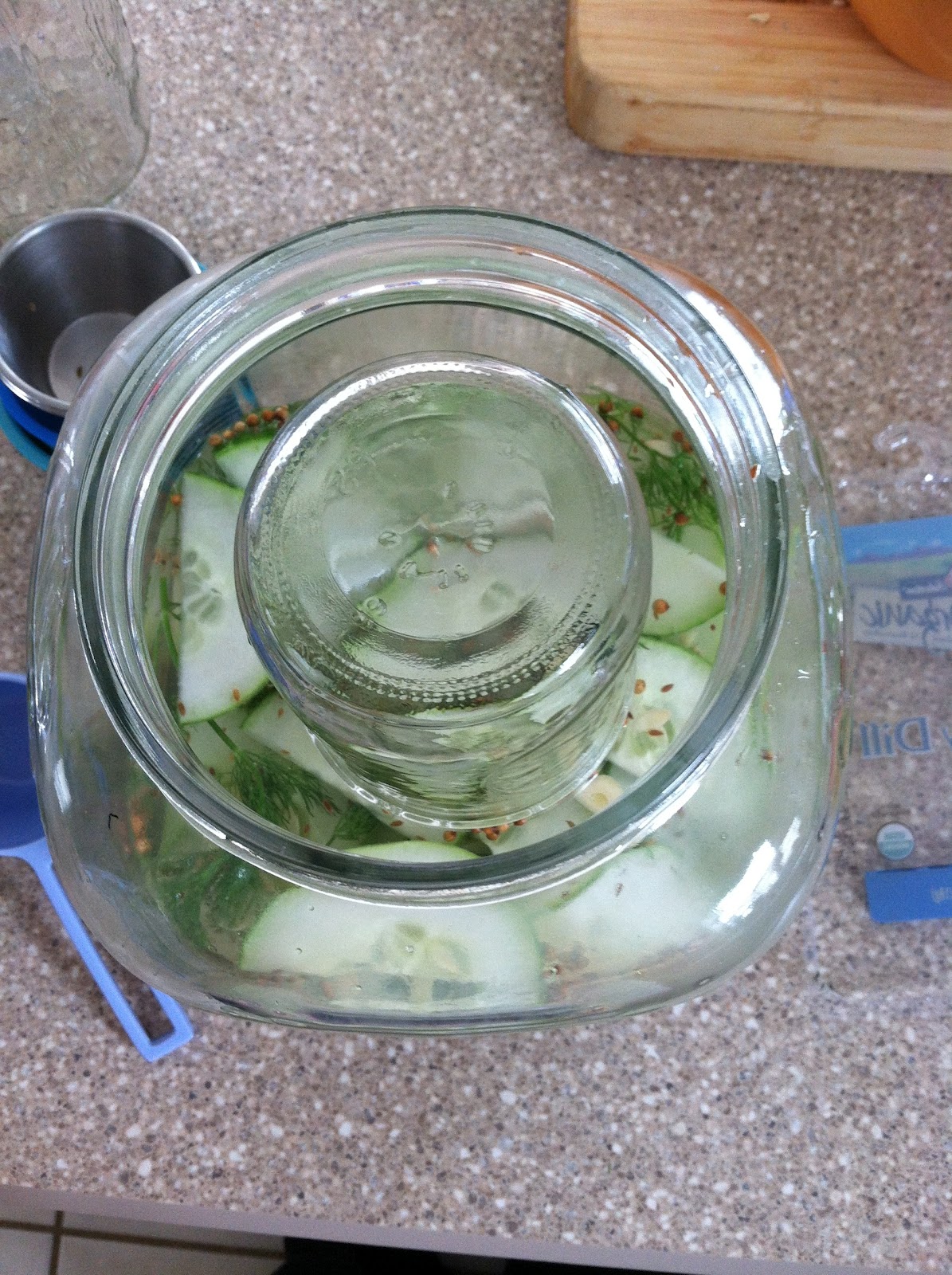 In a large jar (I used a gallon jar) or large bowl with a lid, make a layer of cucumbers, fresh dill and garlic. Then make another layer, then another and repeat until you use everything up.