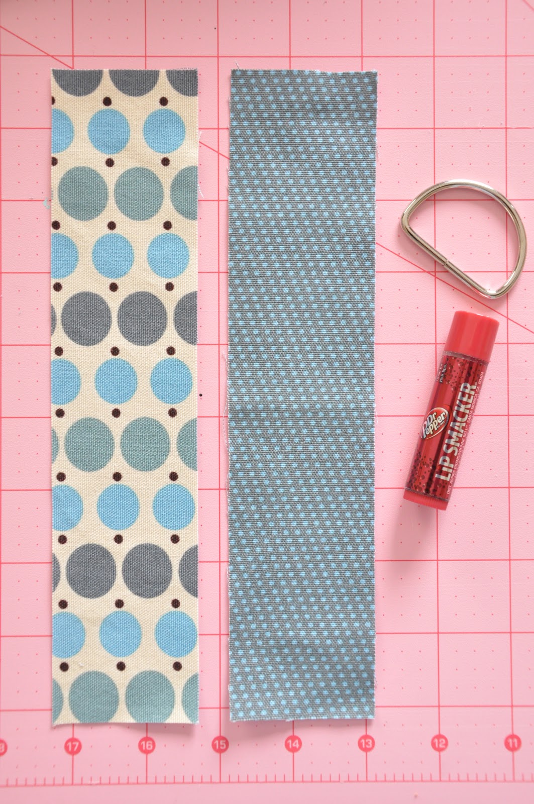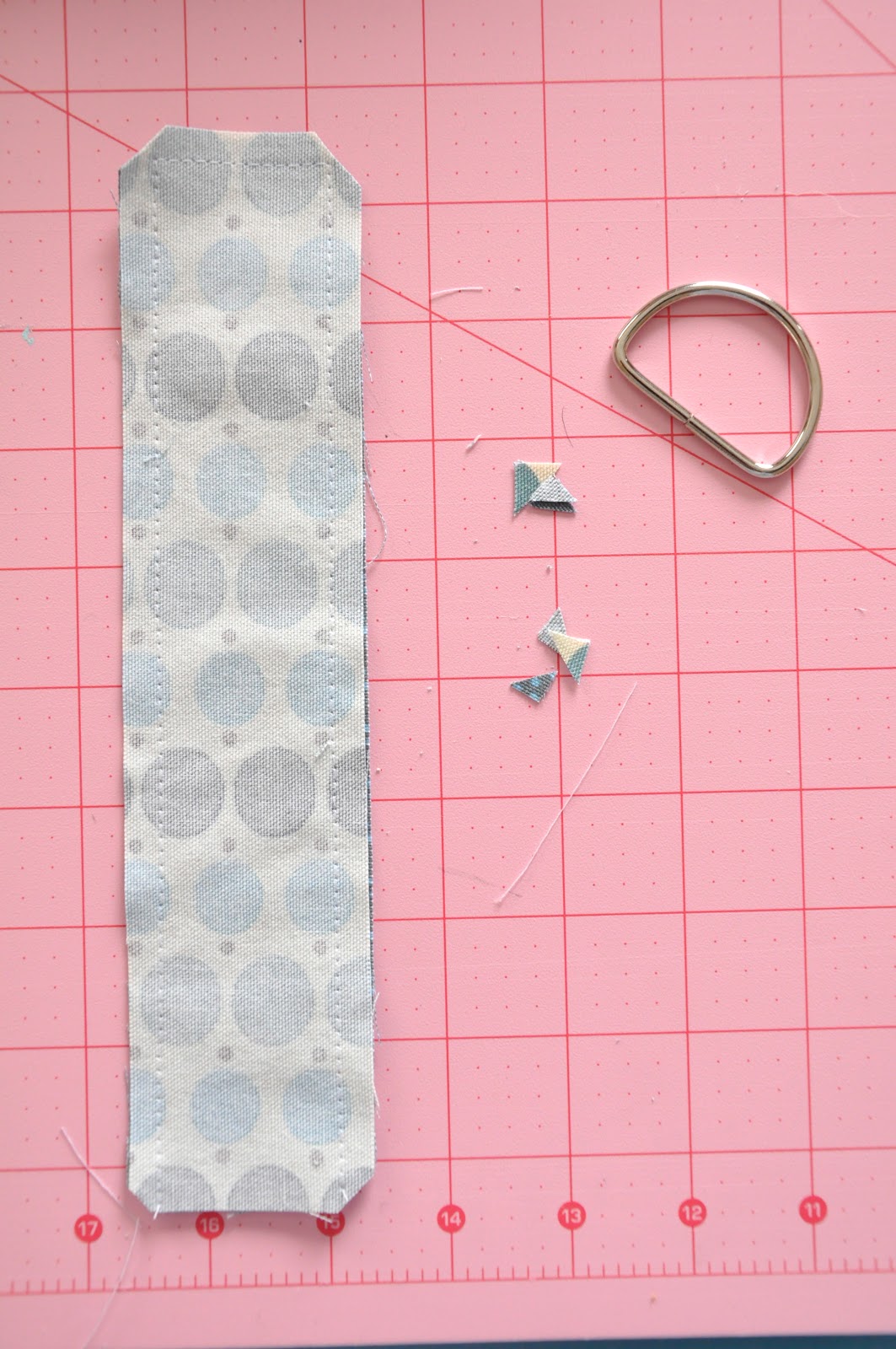 You need two pieces of heavy weight fabric measuring 2in by 9in each.  If you want to use quilting cotton just strengthen them by adding a layer of heavy weight iron on interfacing OK?  You will also need a d-ring in 2in size (search etsy for “d-ring”).