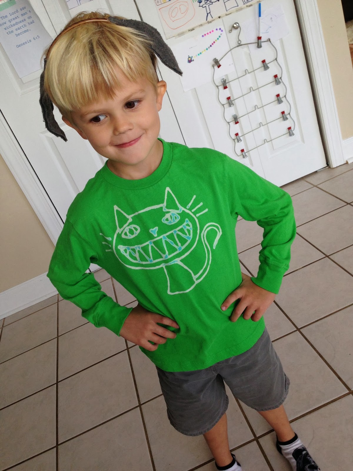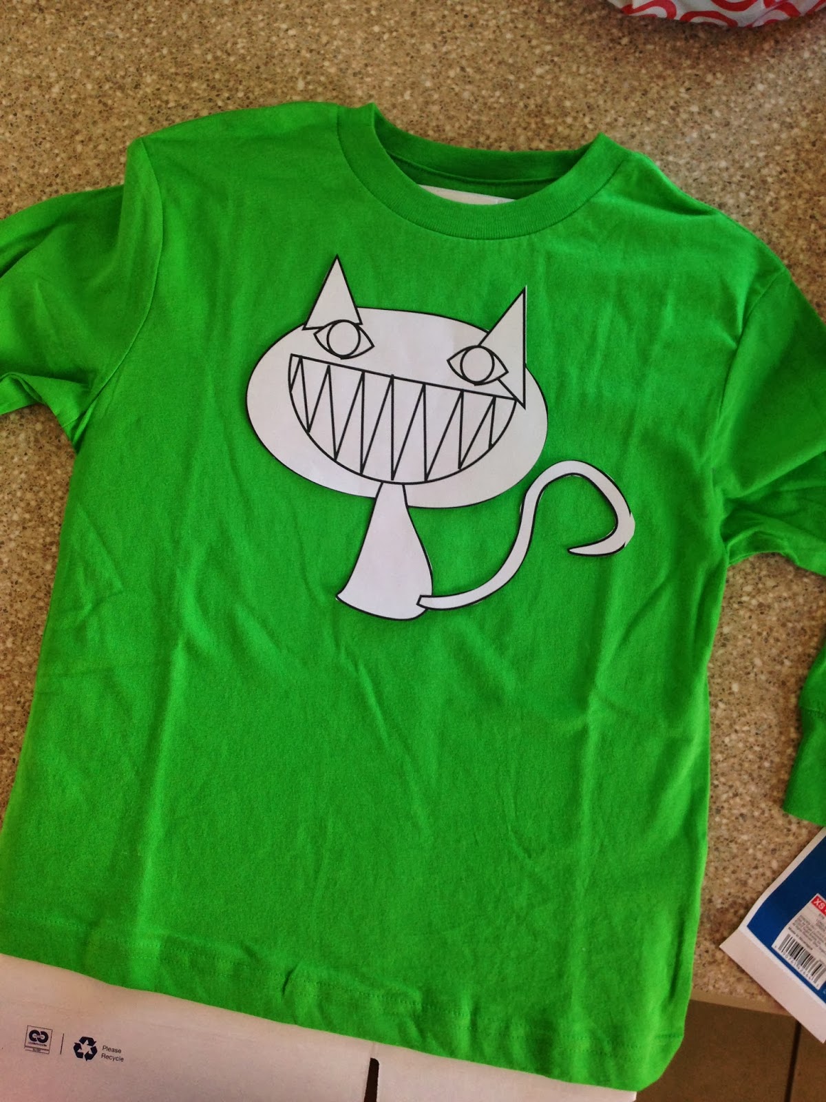 So if you have been following me on Instagram for any amount of time you know that my youngest child has been wearing dog ears for seven weeks straight now.  All day, every day.  Only takes them off for showers and bed time.  What you may not know is that he is equally obsessed with wearing cat shirts, as in shirts with cat images on them.  Interesting little one this kid is. 🙂 As you can imagine, cat shirts for boys are a weeeee bit hard to come by and since I was already planning on trying out this method for making a shirt for Moses I thought I’d practice on a wacky cat shirt for Aaron.