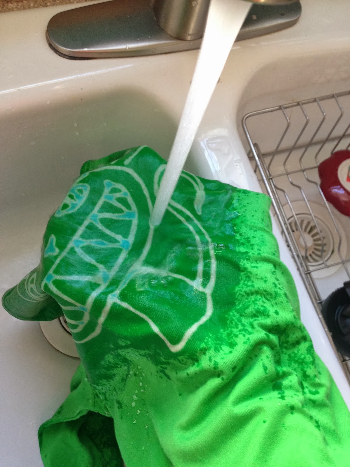 Once it’s “cured” I found that the best way to remove the bleach gel is to hold the shirt under the flow of water and follow the outline until all the bleach is removed.  Wash in cold water and dry as usual!