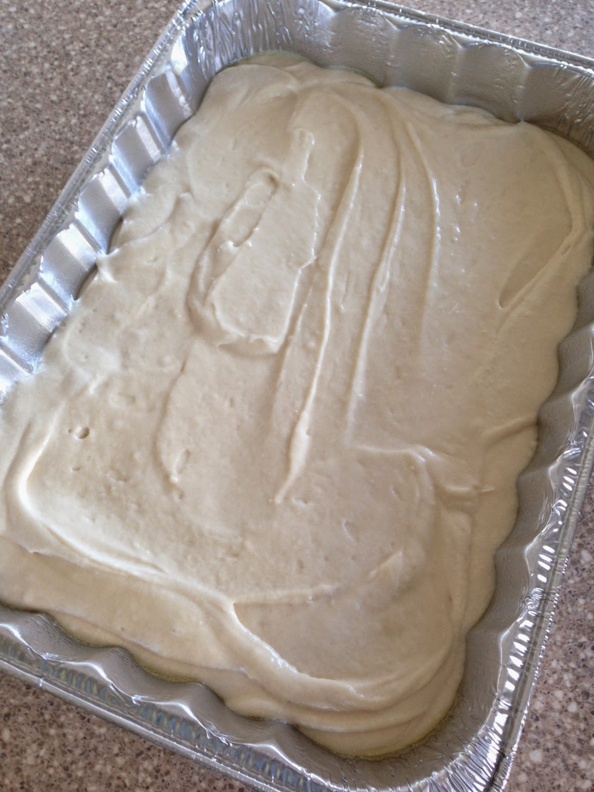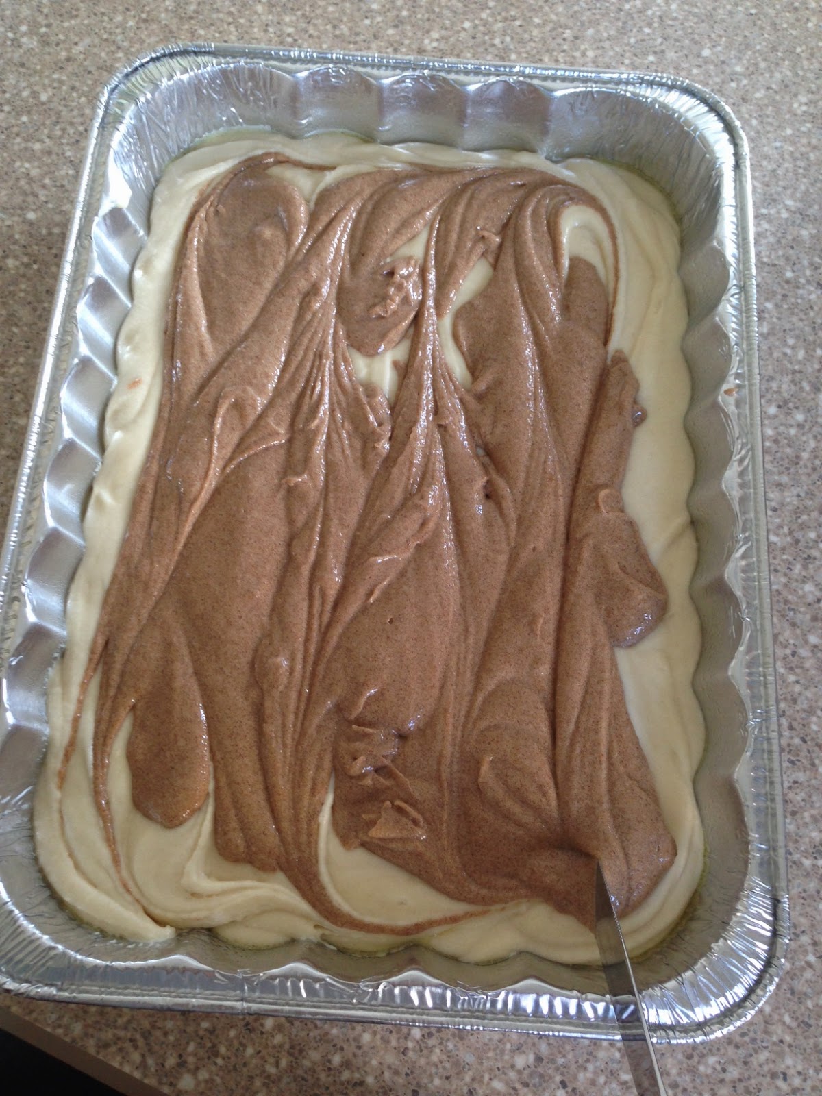 Once you have your mixture ready, you will pour it over the cake batter and mix it all around.