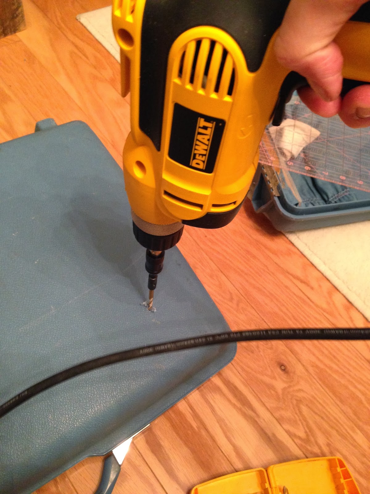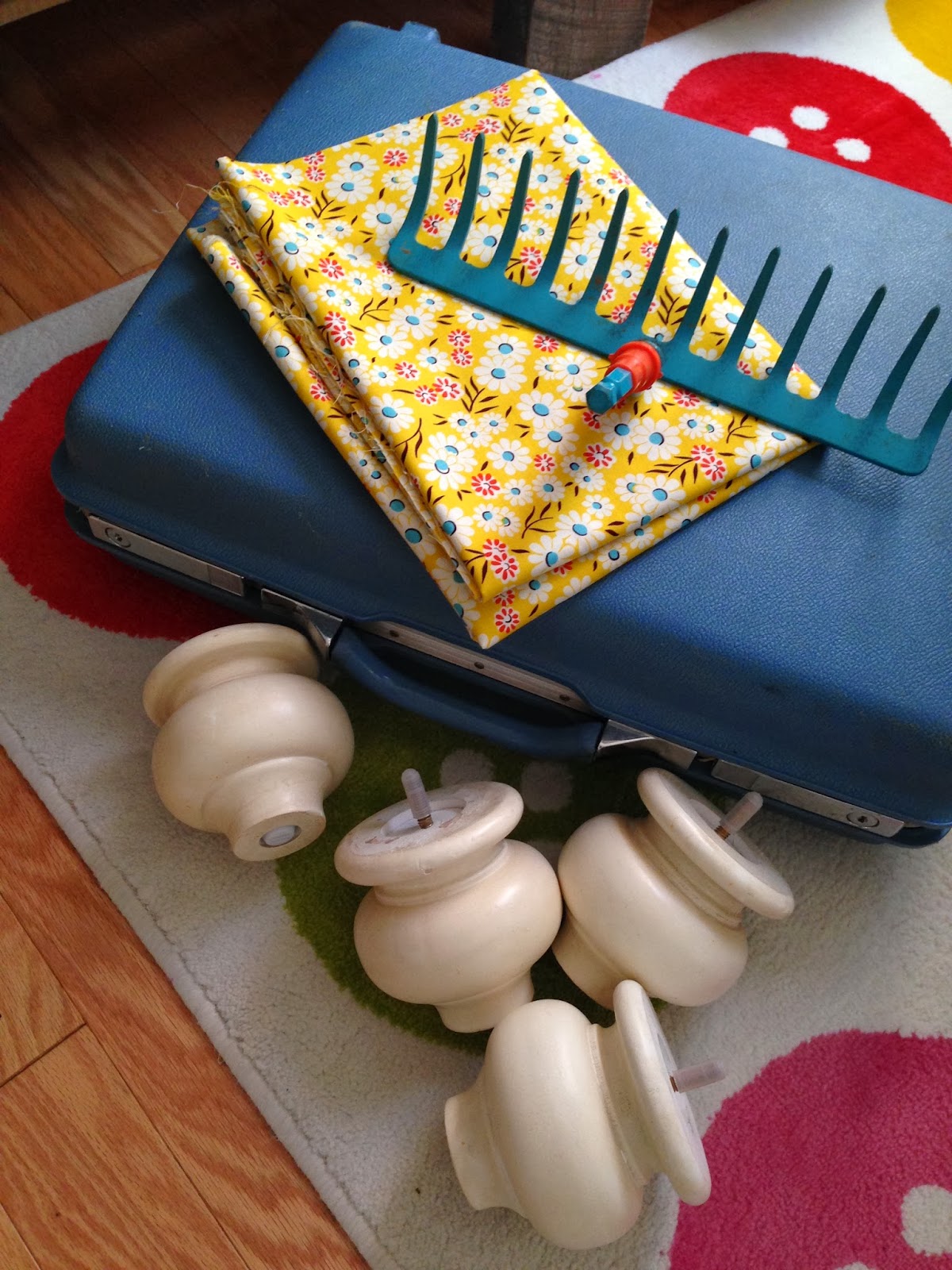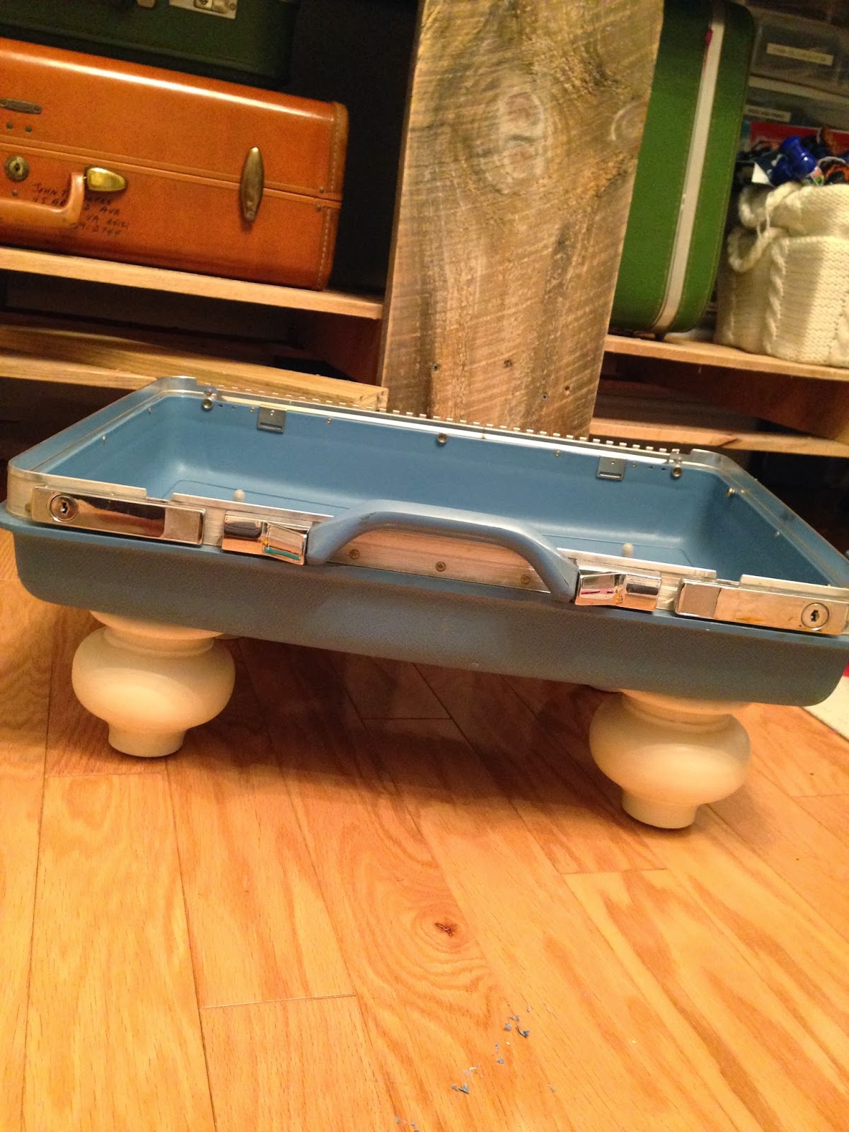 Here is what you need, minus the rake (I am using that to hang necklaces!). You need a hard-shelled suitcase, I paid about $4 for this one from Goodwill. You need some legs. Now originally I was going to dismantle a chair or table that had the right legs but ended up finding these sofa legs at a local thrift store for $1 a piece! 🙂 Plus they already had screws and caps for the screws! It was a lucky find! Keep looking and be patient, you’ll find the right materials!