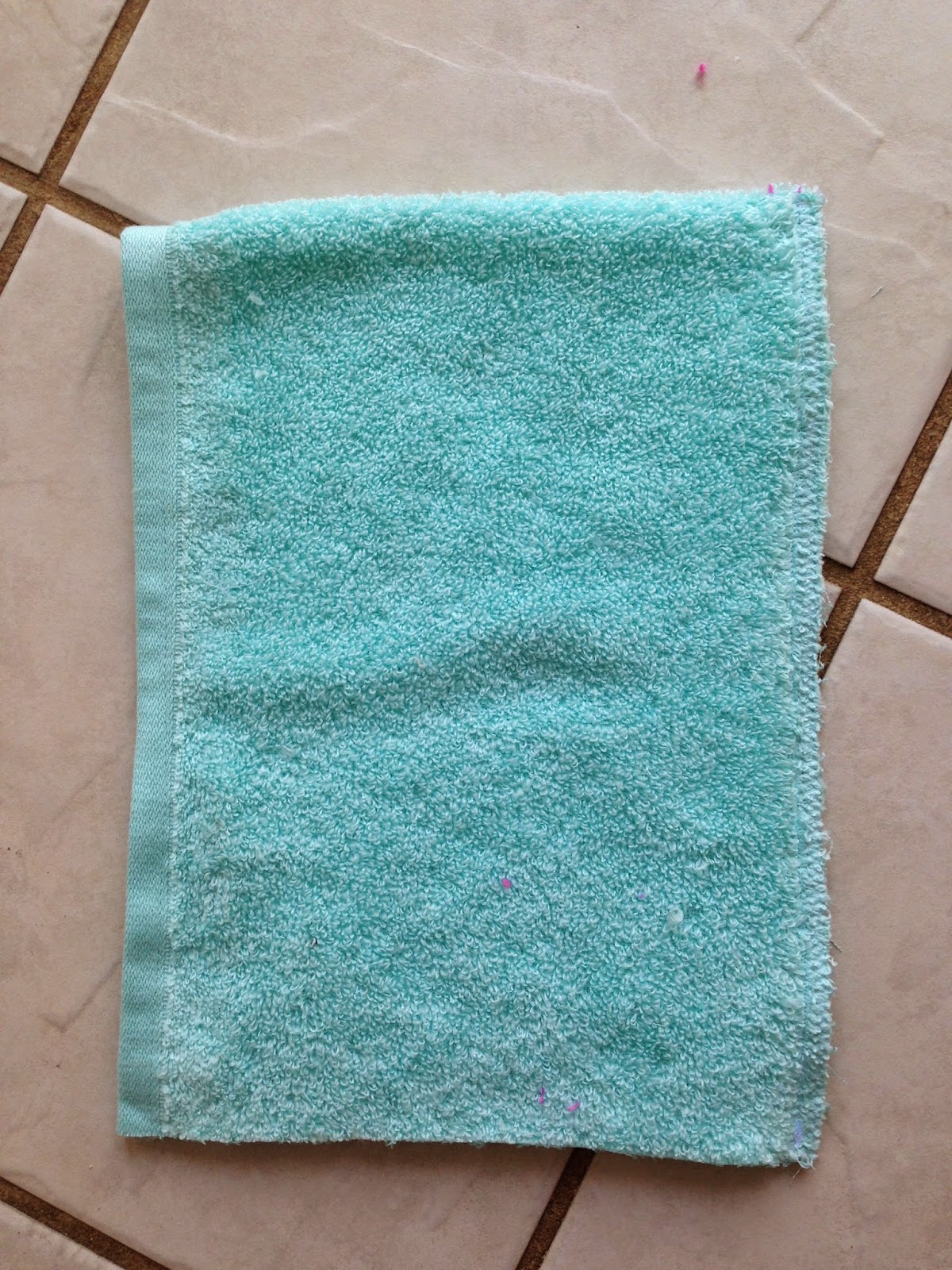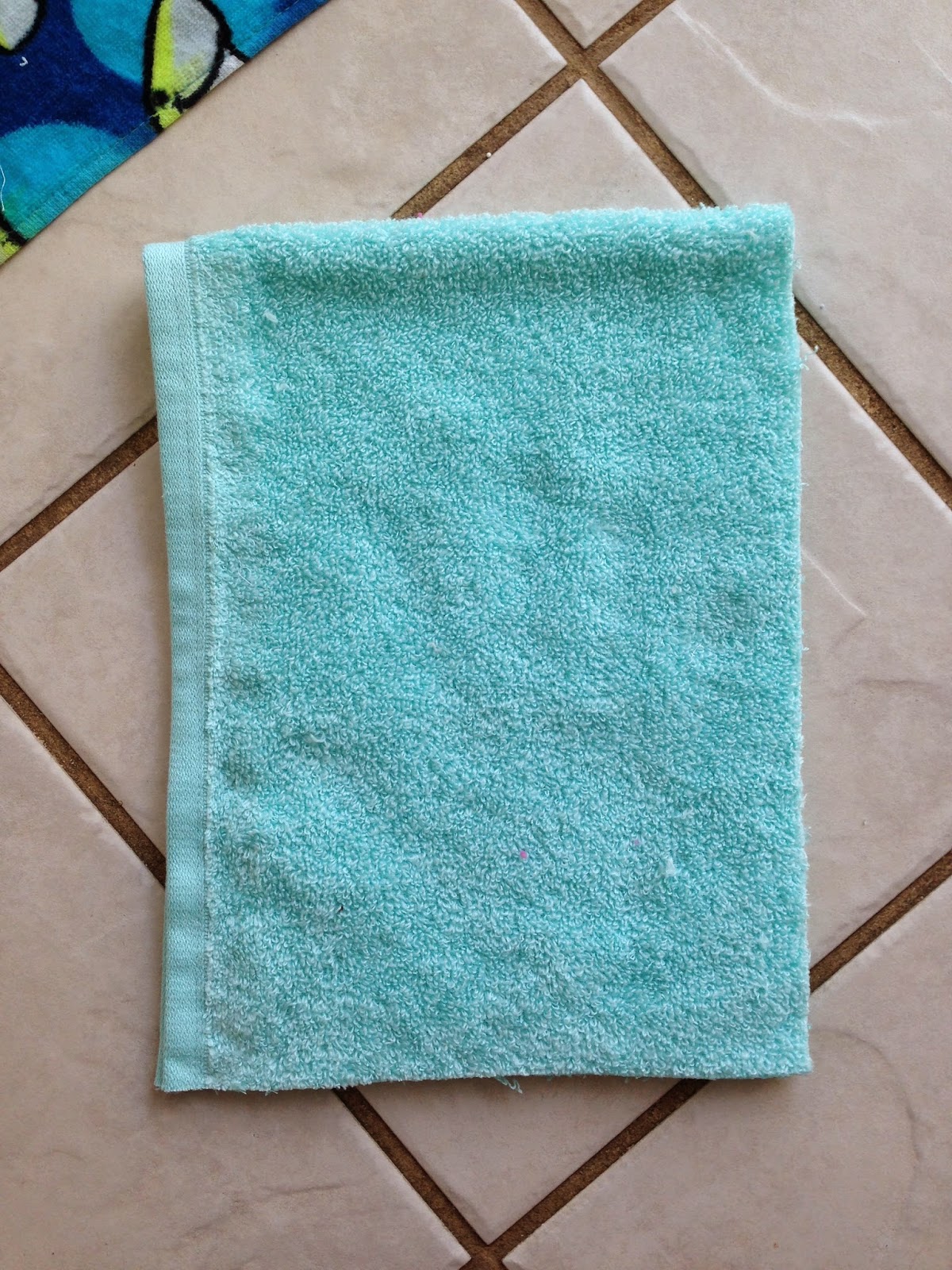 You will need a beach towel (I got mine at TJMaxx for $8) and a coordinating hand towel (or a regular towel if you plan on making multiples) cut into a 9in by 18in rectangle (with a finished edge as one of your long edges) see photo above. Fold it in half as shown above.