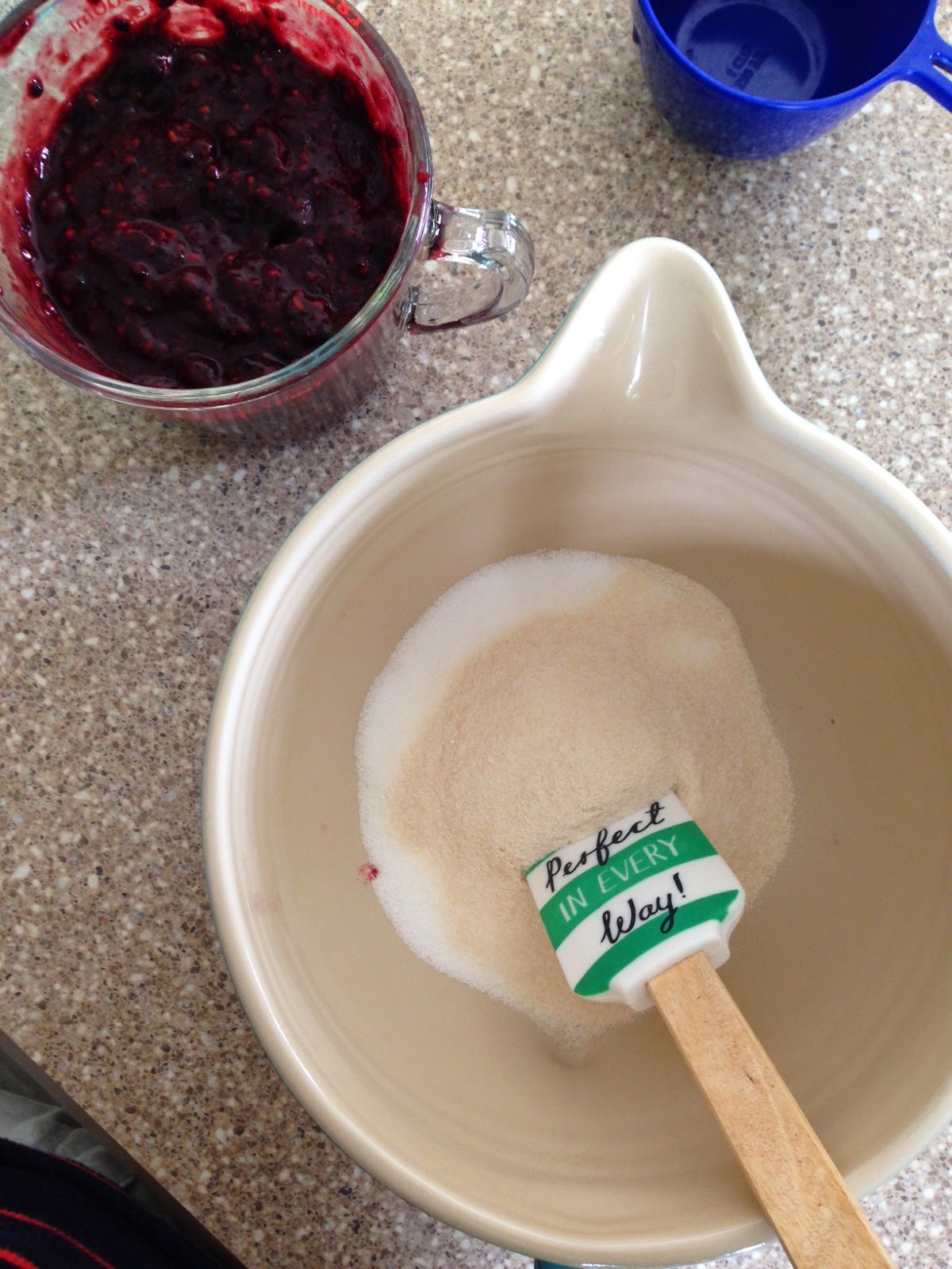 It’s berry season here in Virginia! I love fresh berries and all the yummy treats that come along with making them! We also have a great local berry farm and as much as I love berries, I also love supporting small local businesses. So whether I need them or not, I try to make an effort to get out there a couple of times a season! Our last visit left us with over a gallon of blueberries and two pints of black berries! Freezer jam is one of my favorite things to do with our berries! So simple and easy! It’s also very kid friendly because there is no heat involved! The whole process takes less than 15 minutes from start to finish and the results can be enjoyed year round from your freezer! The best part is that the jam is DElicious! It tastes so fresh and yummy and so much better than anything in the stores!