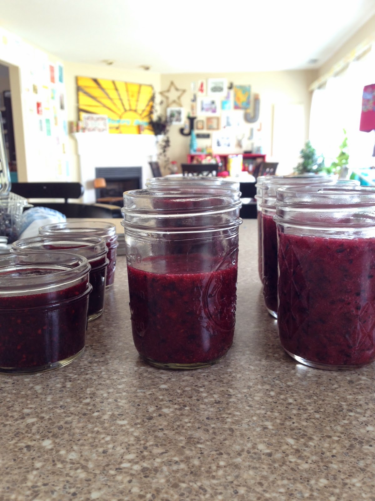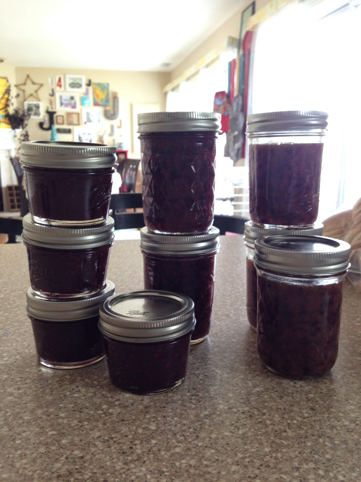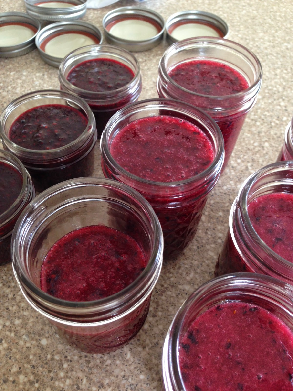 These jars represent three batches of freezer jam. It’s best to make them in small batches to ensure that the pectin will behave properly.