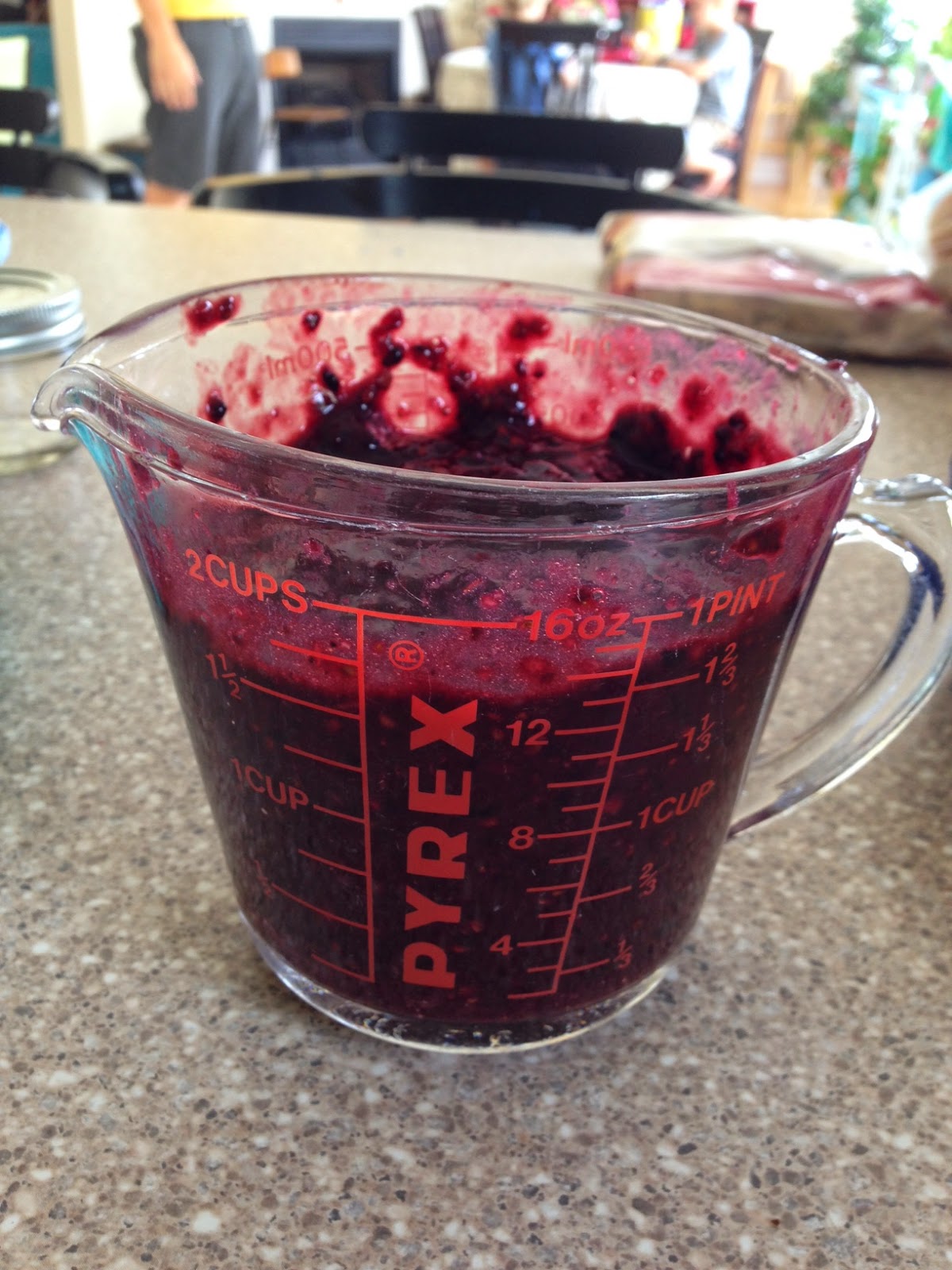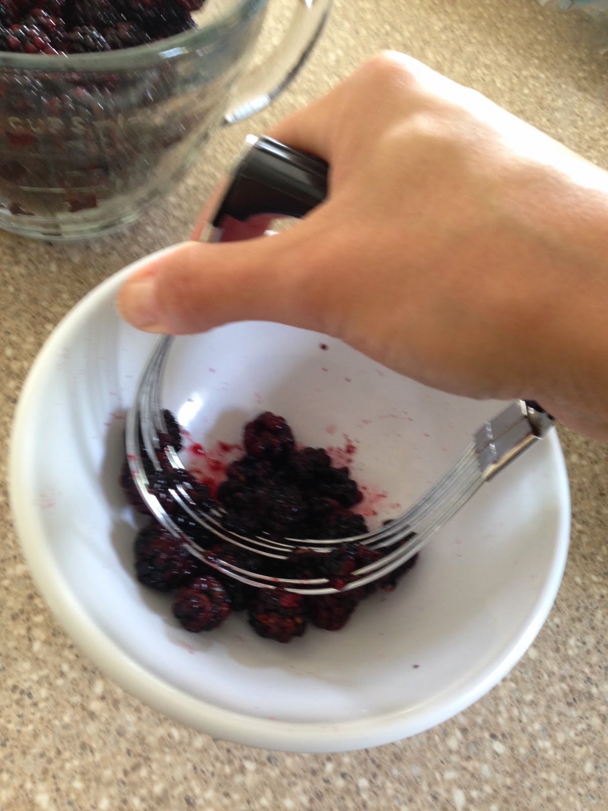 Then you can either mash the berries like so (one layer at a time) OR my favorite method is to use my immersion blender. It makes quick work of all of the berry parts and leaves you with a nicely textured fruit mash.