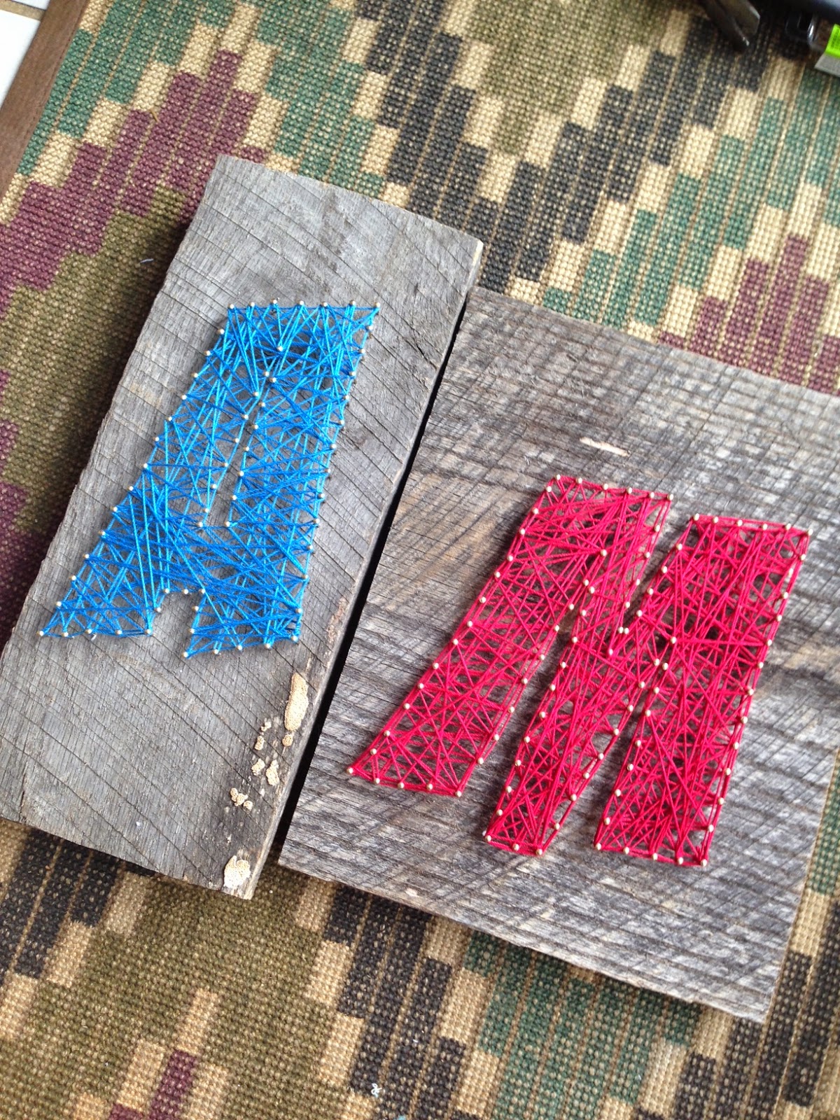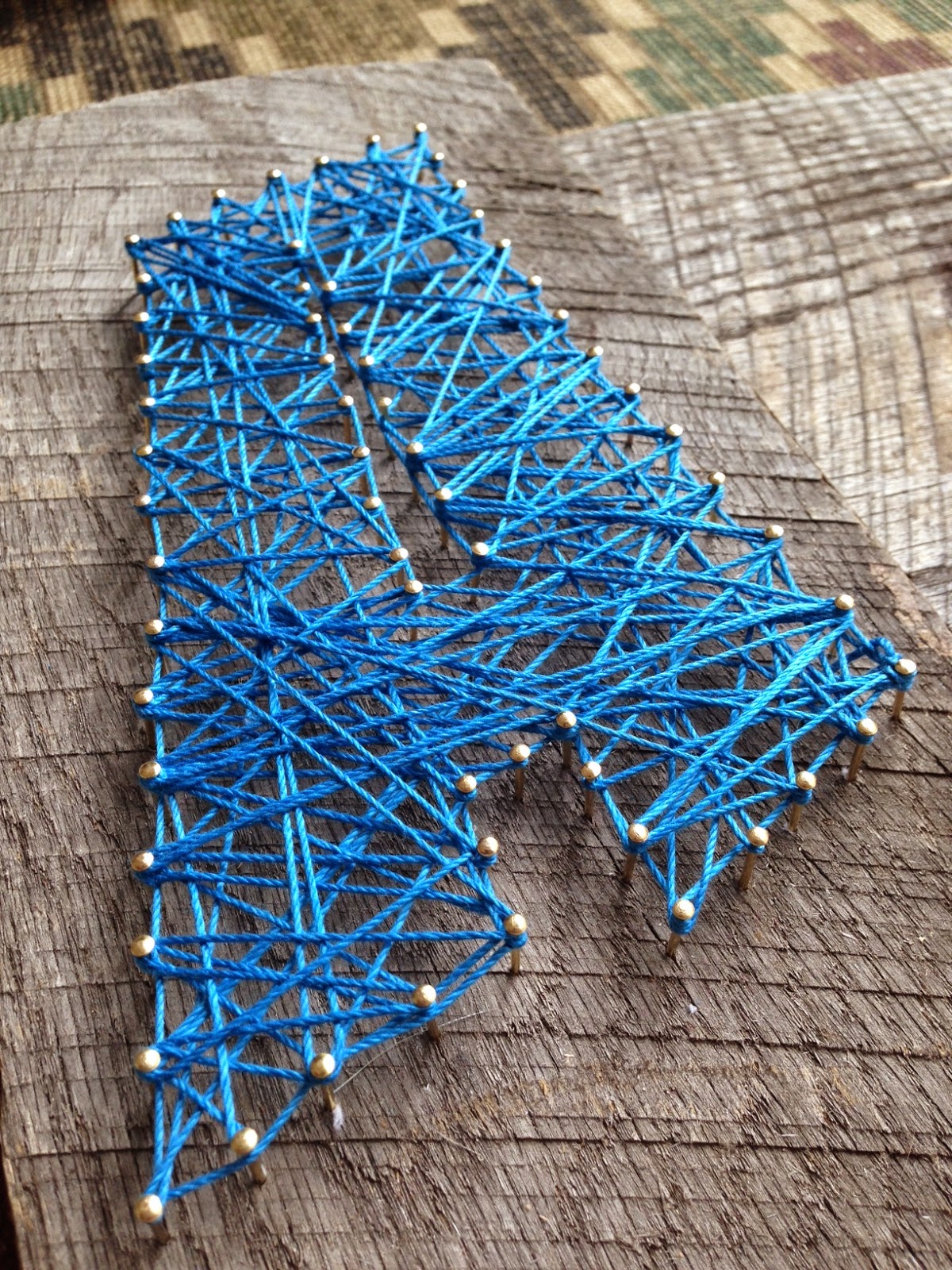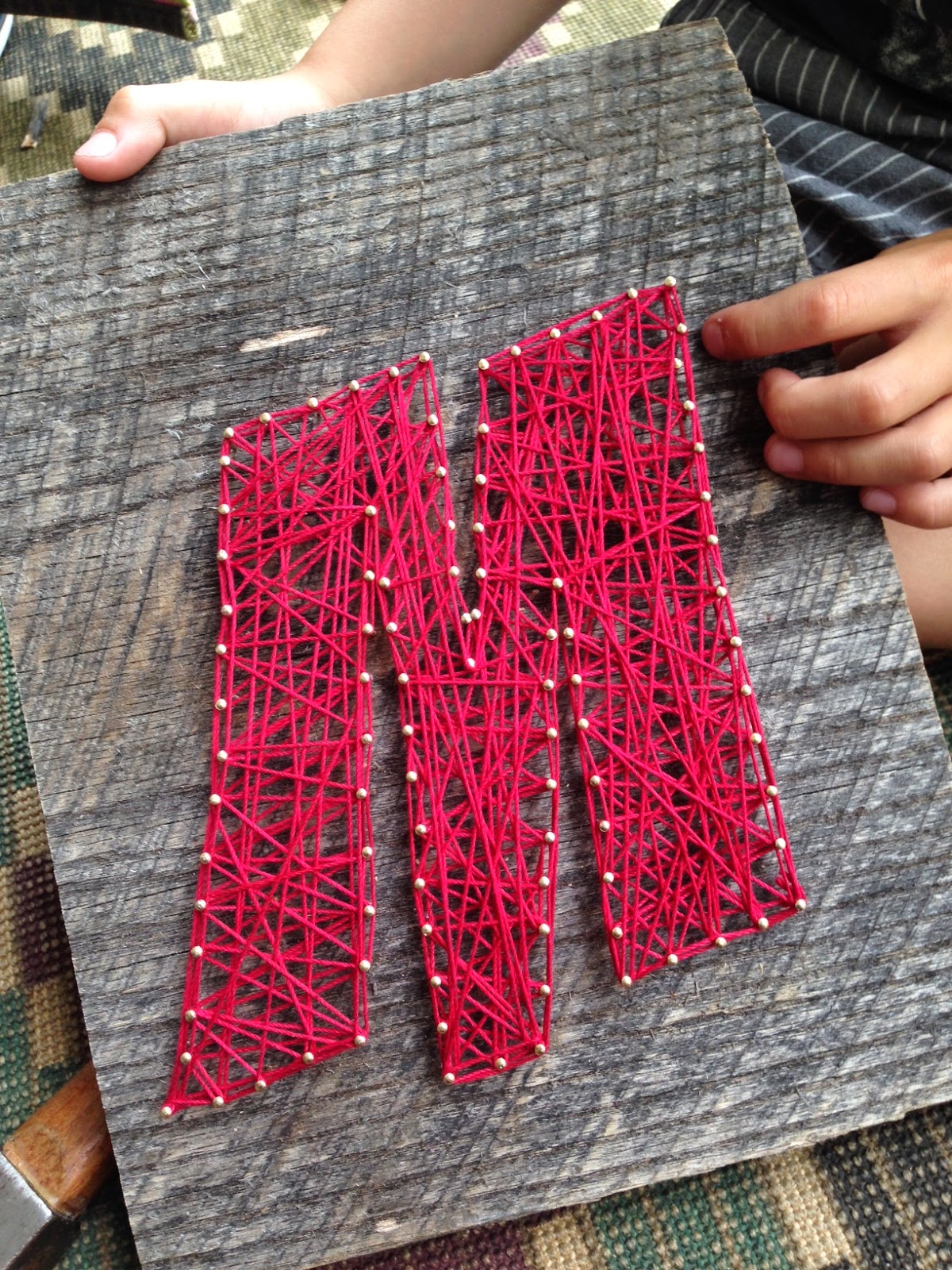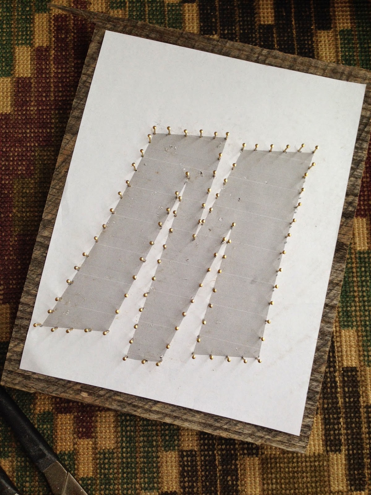 scrap wood, a print out of the letter you want to do that matches the size of your scrap wood, pliers, a hammer, small nails (make sure they have a head on them, from Lowe’s), a ruler, a pencil and thin string (found at Joann’s).