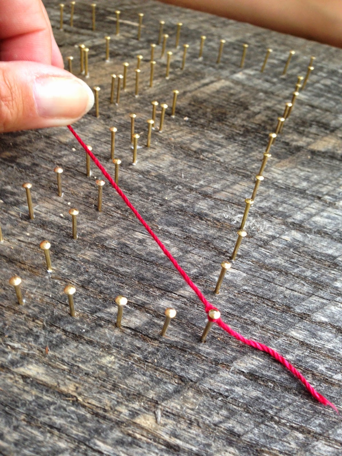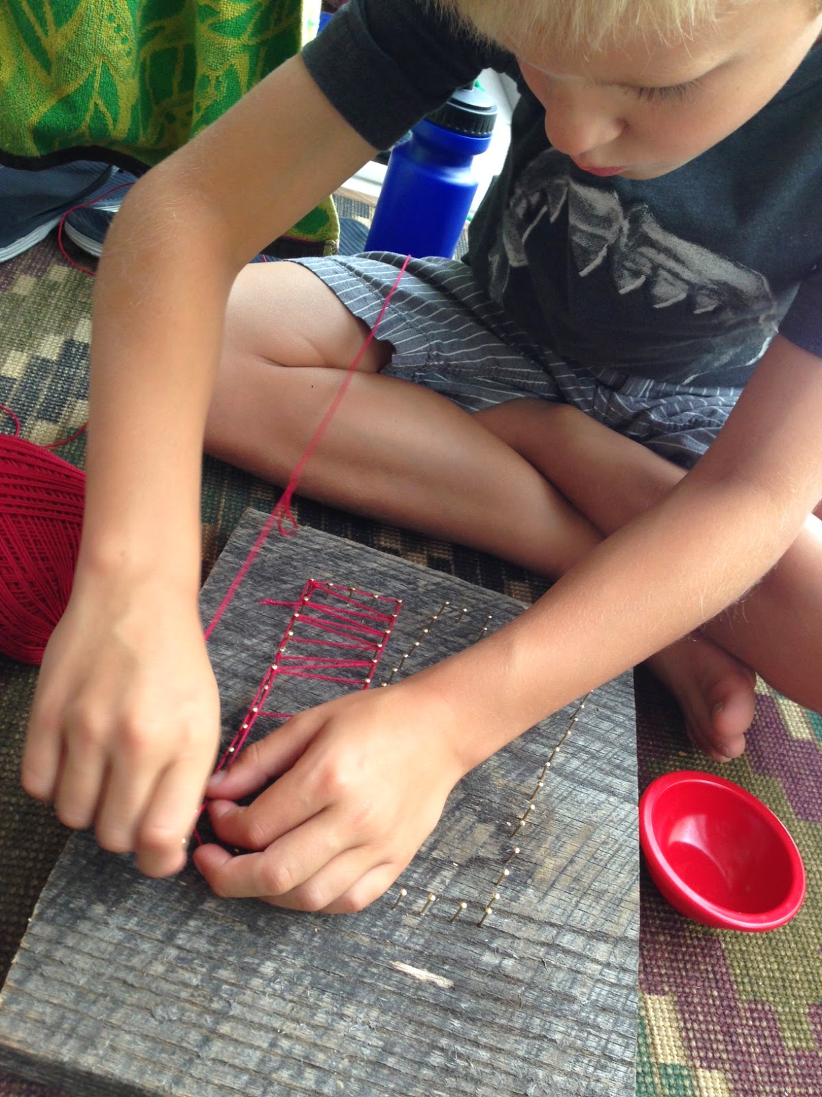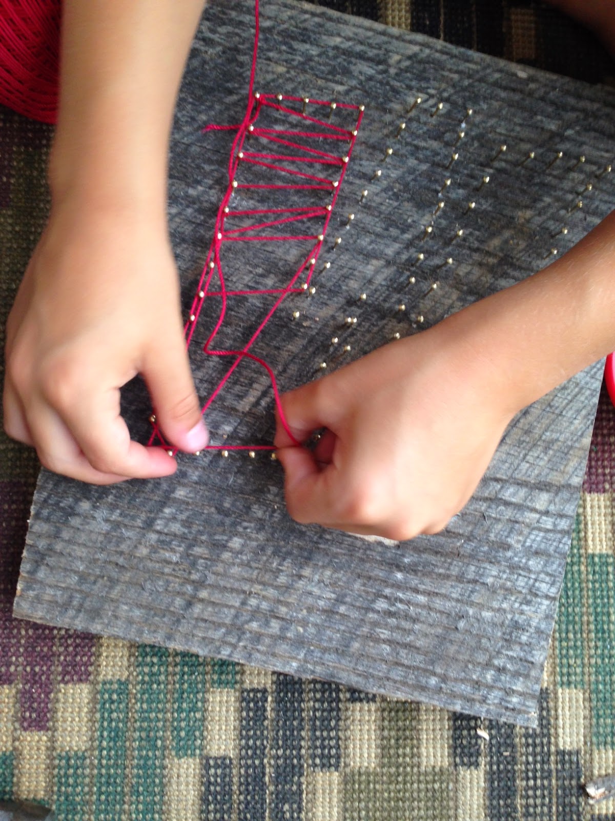 And go to town zig zagging like crazy. Moses really enjoyed this part. I worked with Aaron (5) to do this, I told him to pick a nail for me to end up on and I would zig-zag until I got there.