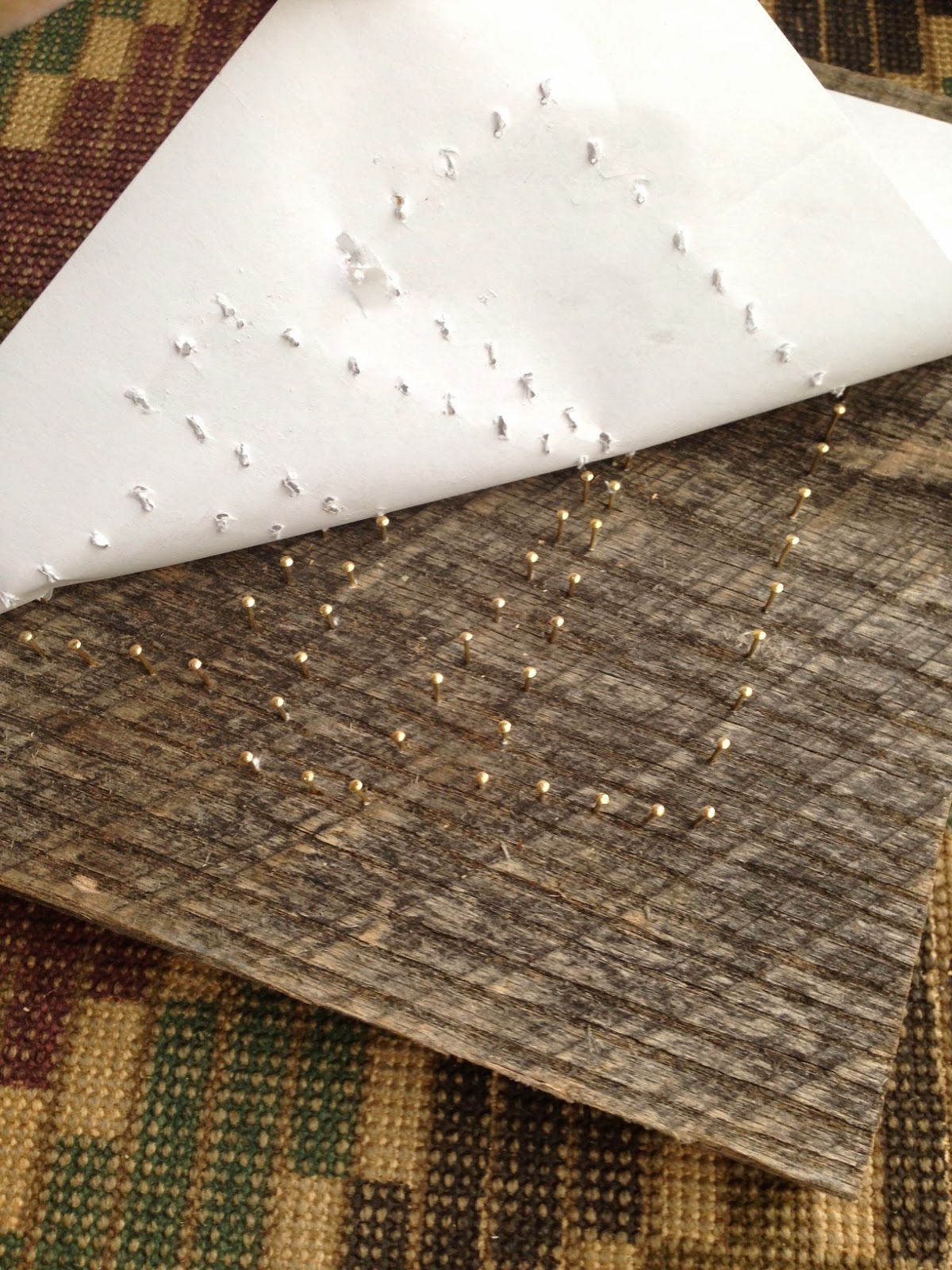 Then using the pliers to hold the nail (and keep them all the same height) hammer a nail into each dot you’ve marked.