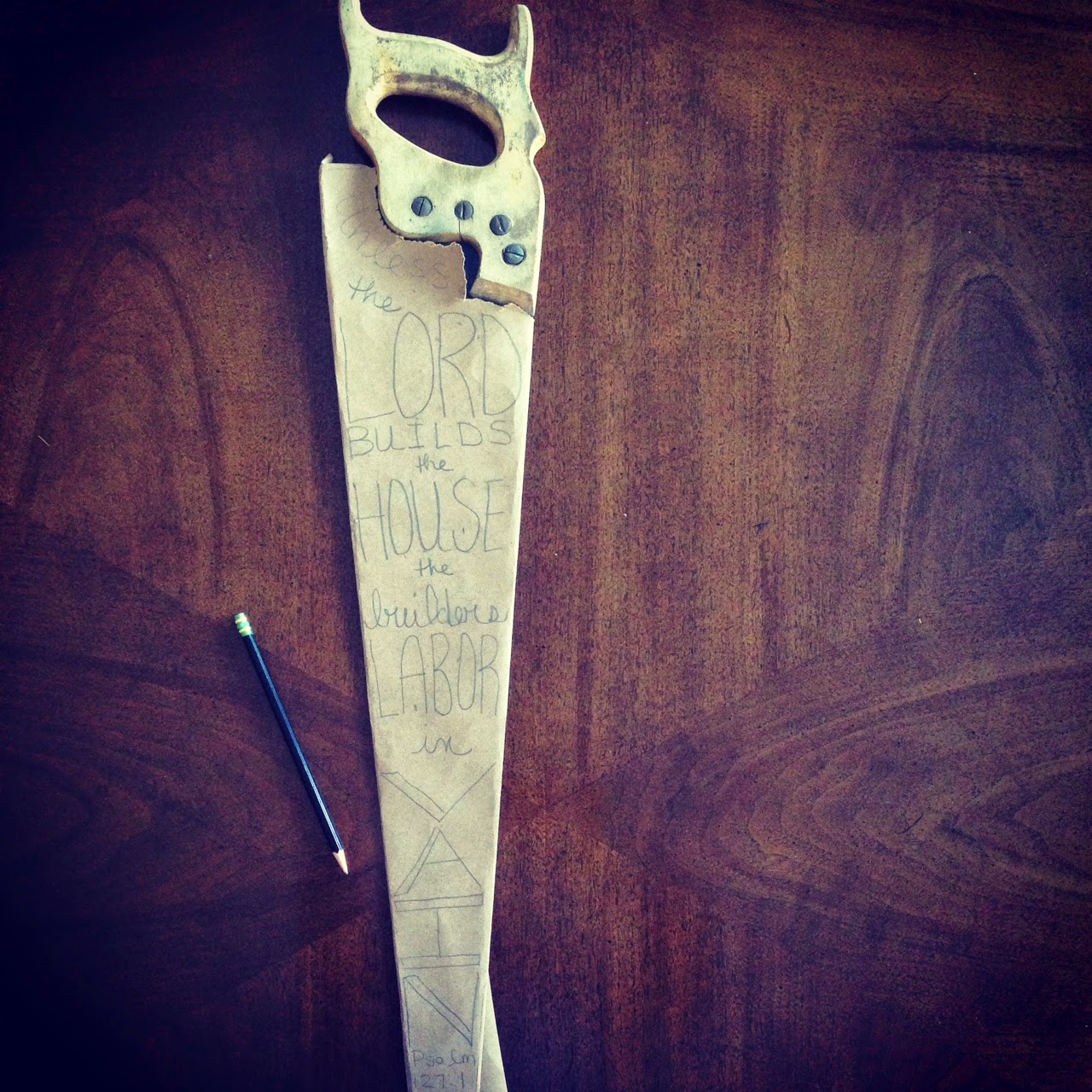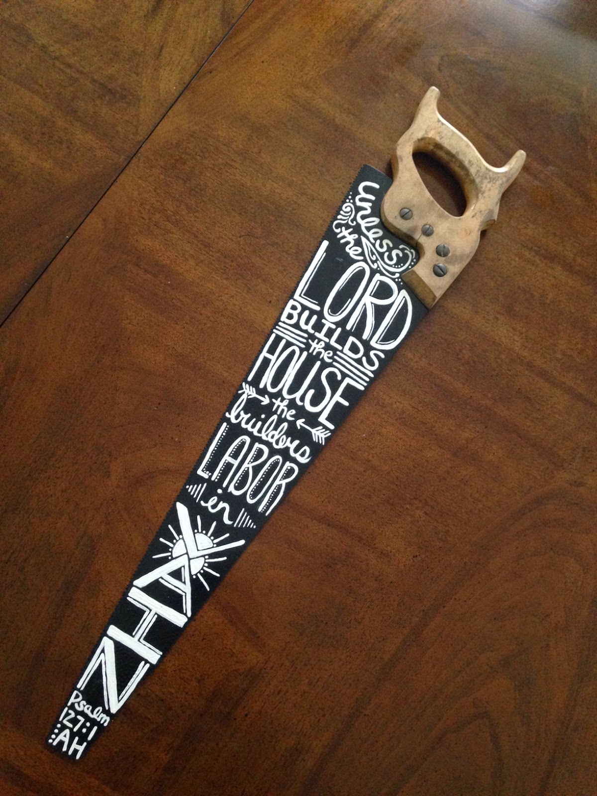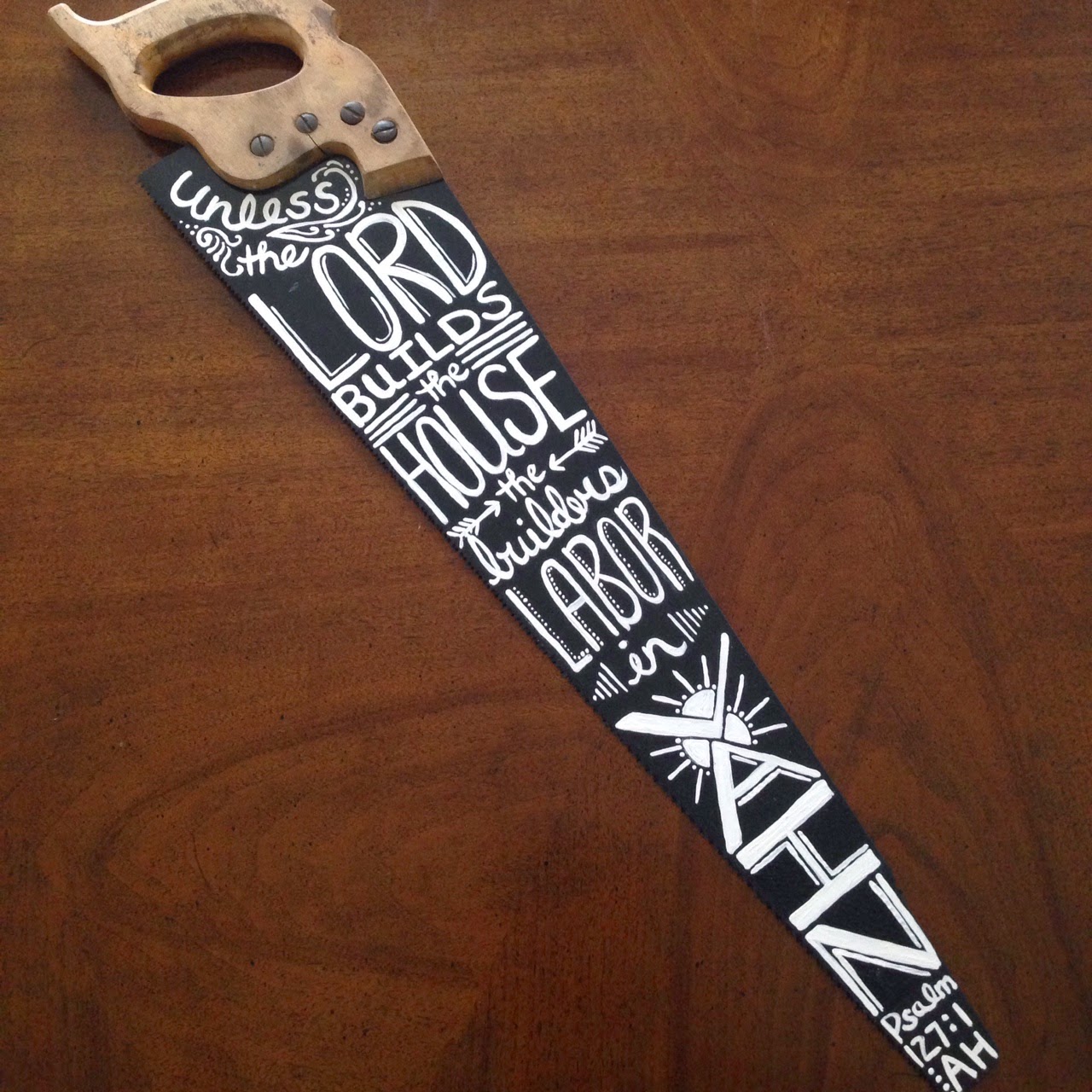 Painting on saws is certainly not a new thing, one quick google or look around at a craft fair and you will find them all over. One reminder that this was a “thing” was all I needed to know that I had to do this with Doug’s grandpa’s saw. We brought it home with us at some point after he passed away and it was just kind of hanging out in our garage. We had a shiny new one, so no need really for a functional saw. But a constant visual reminder of who grandpa was? Well, we can’t have too many of those. So this is grandpa’s saw, with an appropriate verse for a contractor, don’t you think?