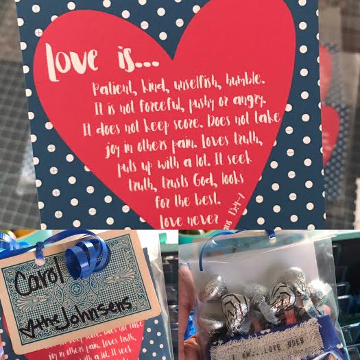 Tomorrow I am  bringing in this printable along with a little baggy of “hugs” and “kisses”  (from hershey).  Our theme this year is “I am…Love Does” hence the love inspired goodies. 🙂