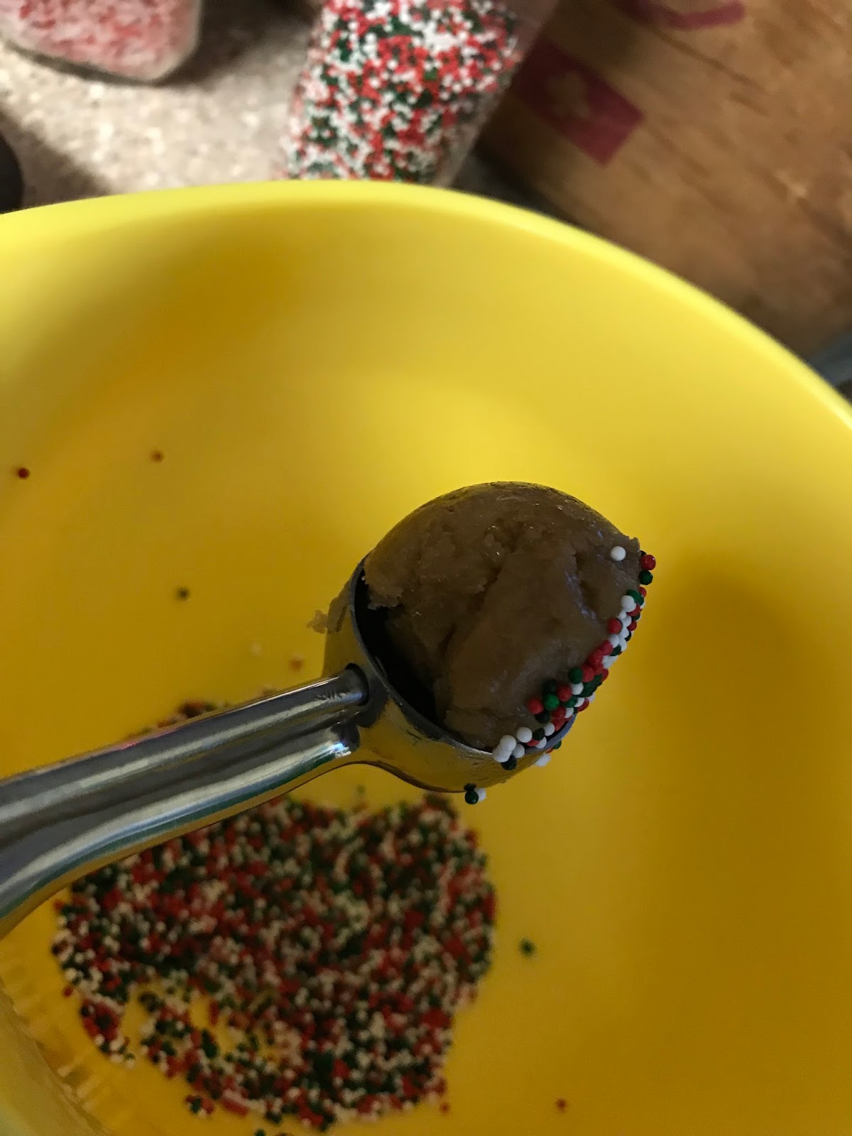 Using a 1 inch cookie scoop, scoop the cookie dough, dab into sprinkles and place on a cookie sheet that will fit in your refrigerator. (see below for photos of that. This method works with any kind of cookies you *have* to roll, which I hate doing.) Refrigerate for about 30 minutes then place 12 to a standard cookie sheet and bake at 350 for about 12 minutes until edges brown.