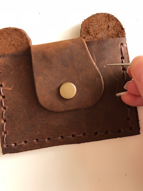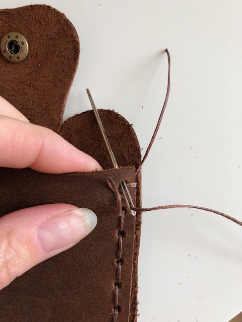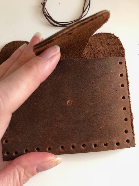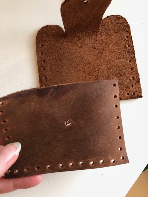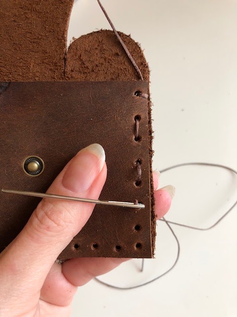 Line up the two pieces and their holes. Begin to stitch the two together using a running stitch.