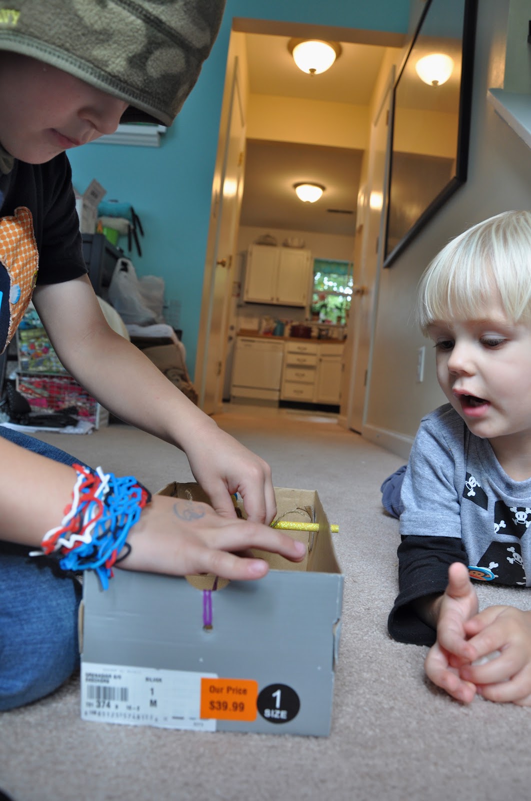 Using a rubber band (I used two silly bands laced together) lace one end through the end of the box and attach the other end to the opposite end of the pencil holding the button.