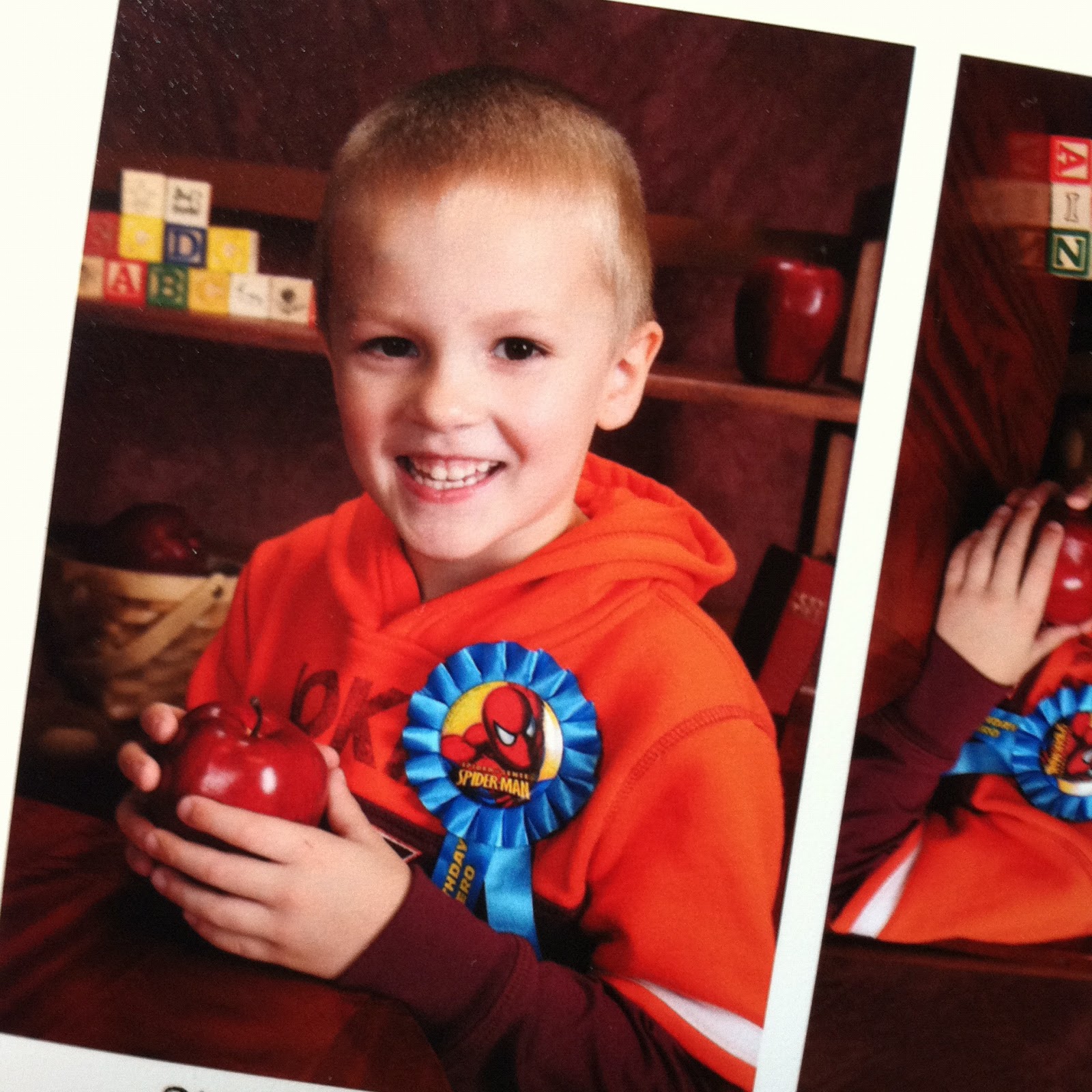 But I made an exception for this gem. Cheesy background, Moses wearing his current favorite outfit complete with a spiderman birthday ribbon and a fake apple. How could I not buy it?