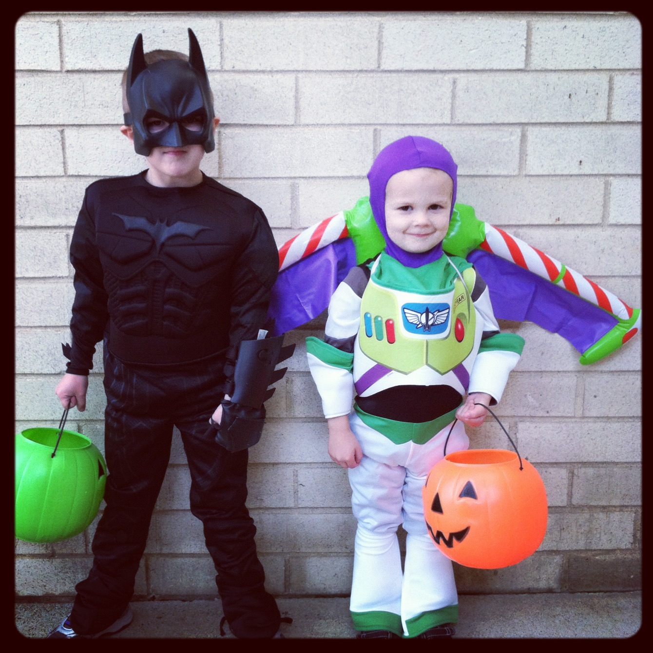 Today was trick or treating at the mall. I called it practice. And it was indoors (read warm on the first time I remember SNOW in Virginia in October in a long time). And these guys are the cutest batman and buzz ever. Except for the fact that while wearing this costume, Aaron WILL JUMP OFF of any piece of furniture in the house while yelling “I can fwy…to difinity and beyond!!!”