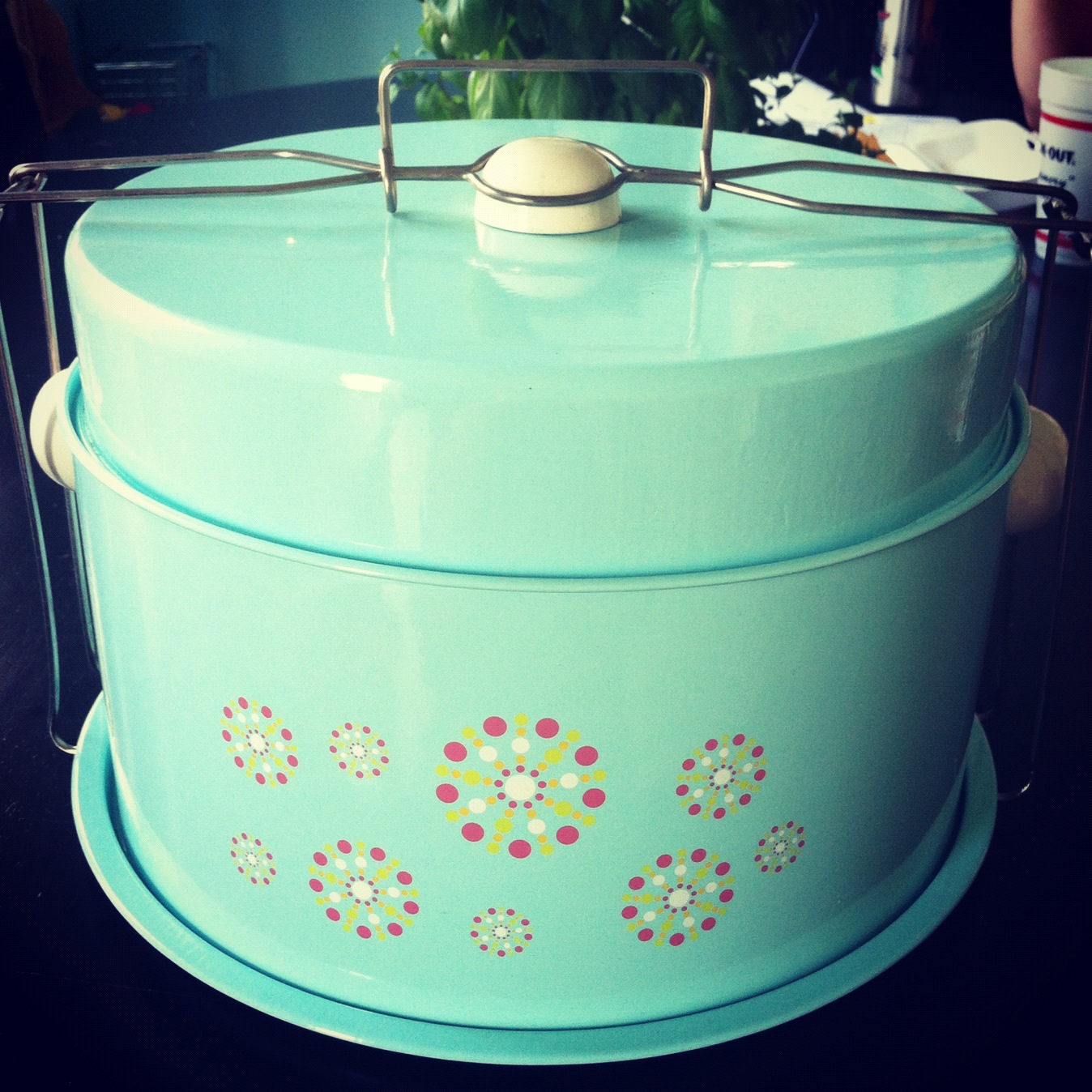 Do you love this cake carrier or what? My husband is good to me. Get your hubby to get you one from World Market. It’s made of tin, vintagey and the best shade of aqua.