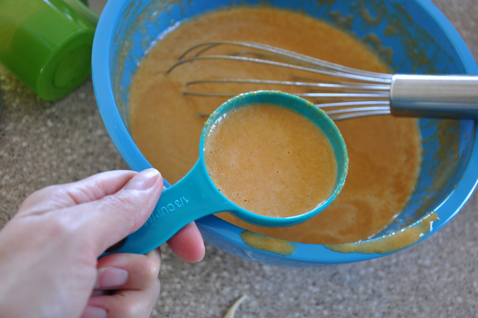 I used a 1/3cup measuring cup that wasn’t quite full to fill the regular muffin cups.  I used 1/4cup measuring cup that wasn’t quite full to fill each mini muffin cup.
