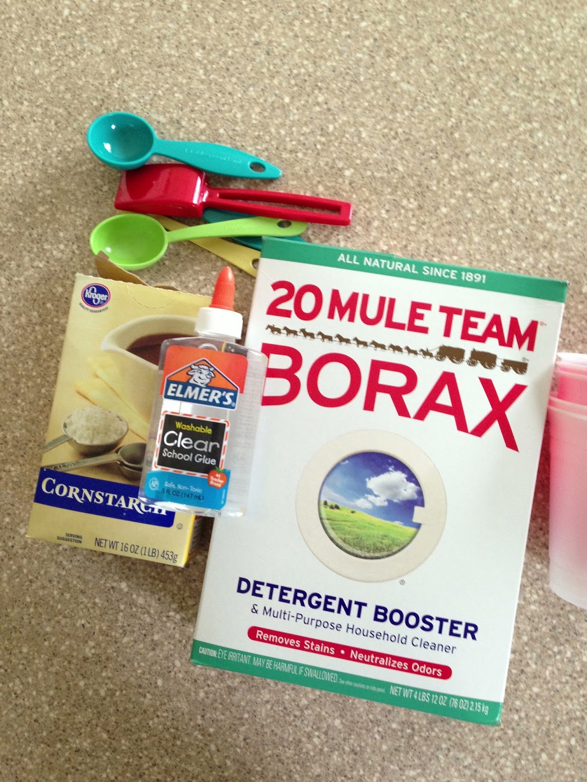 1) Dissolve 1/2tsp of borax into 2 tbl of warm water in the first plastic cup. Stir until dissolved. Add food coloring if you would like.