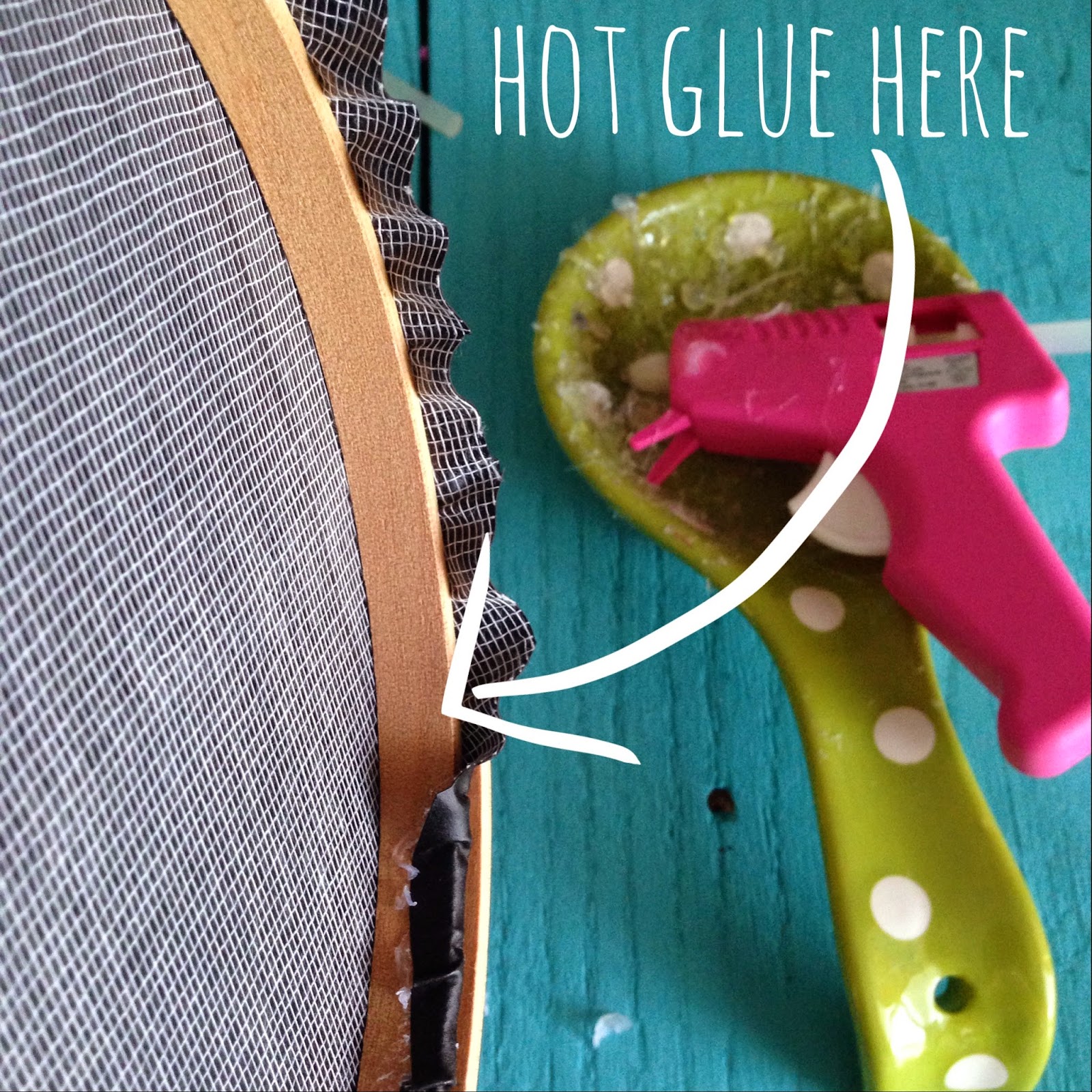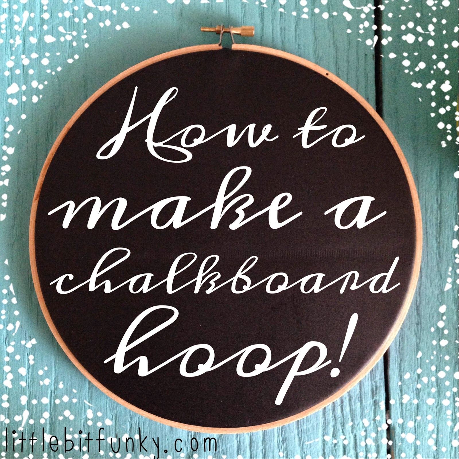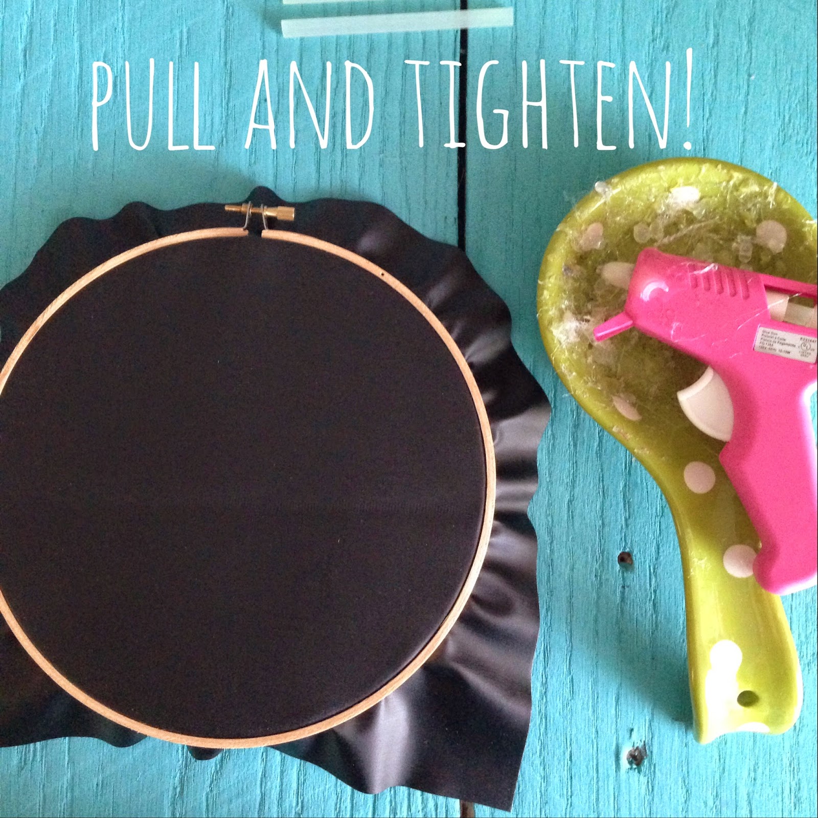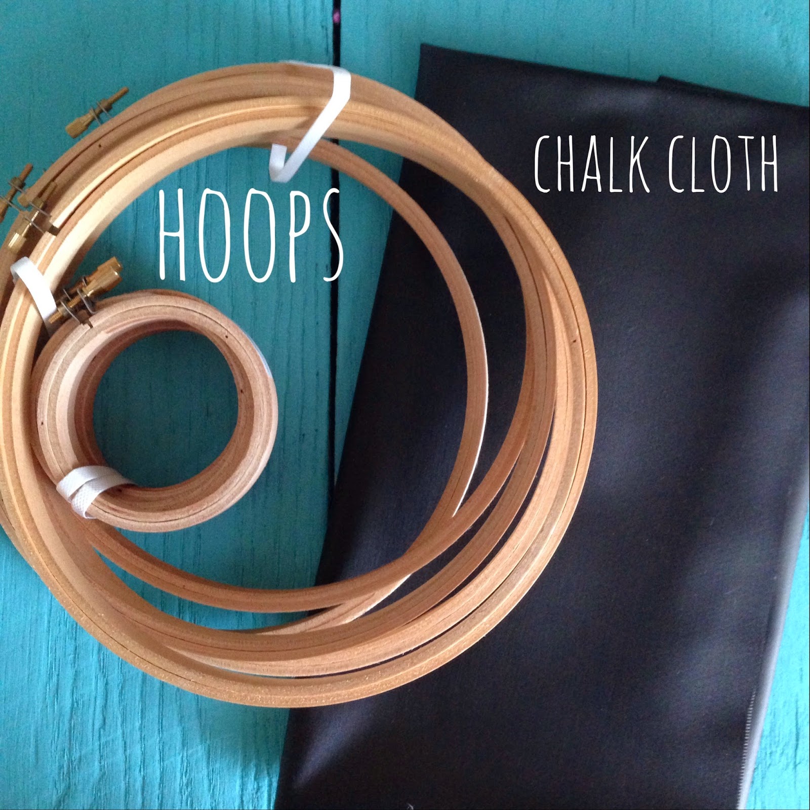 All you need are embroidery hoops (I buy them from consumer crafts online) and chalk cloth (found on etsy) and hot glue.