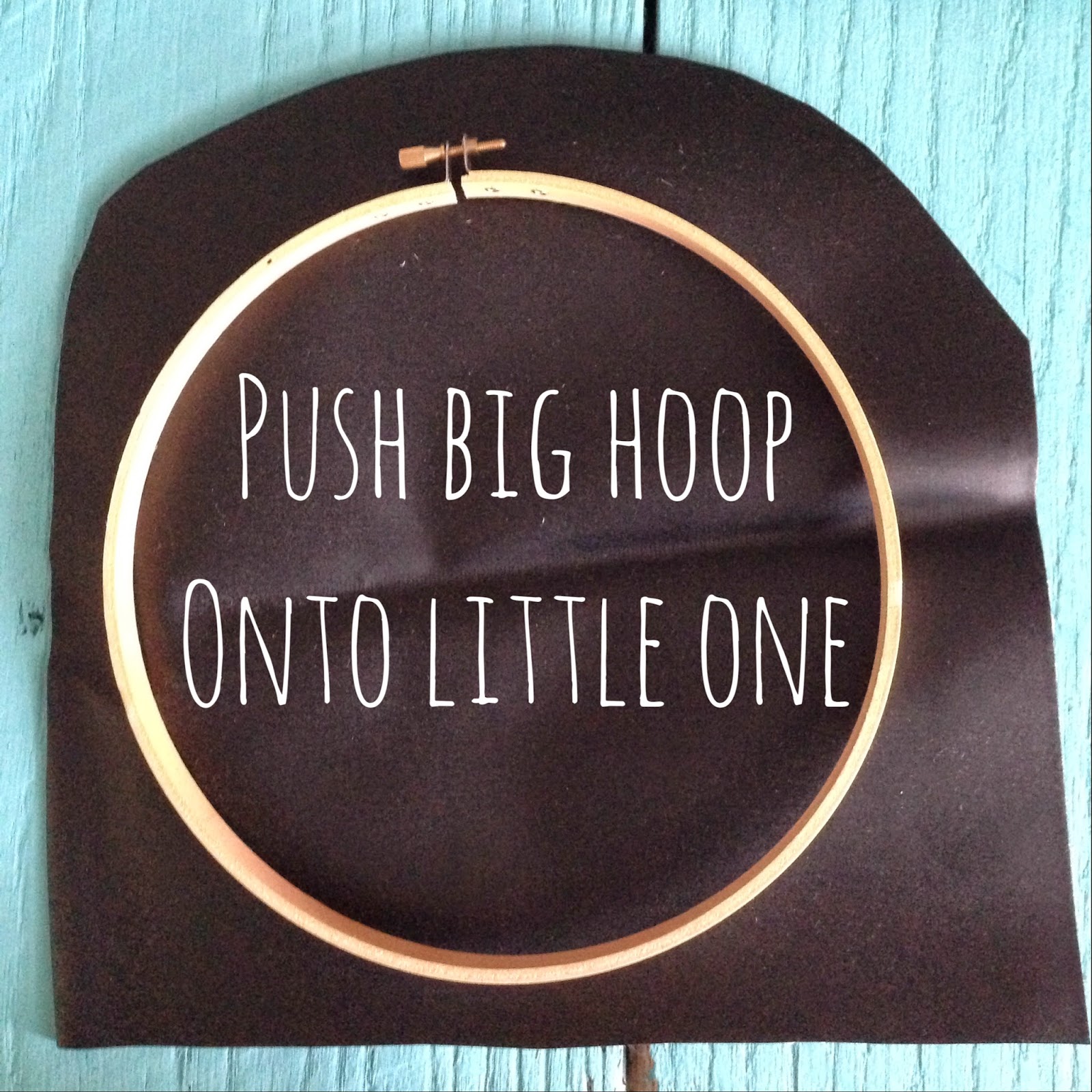 Push the larger hoop (with the top part unscrewed almost all the way) onto the little hoop. It may take a little muscle because chalk cloth is thick!