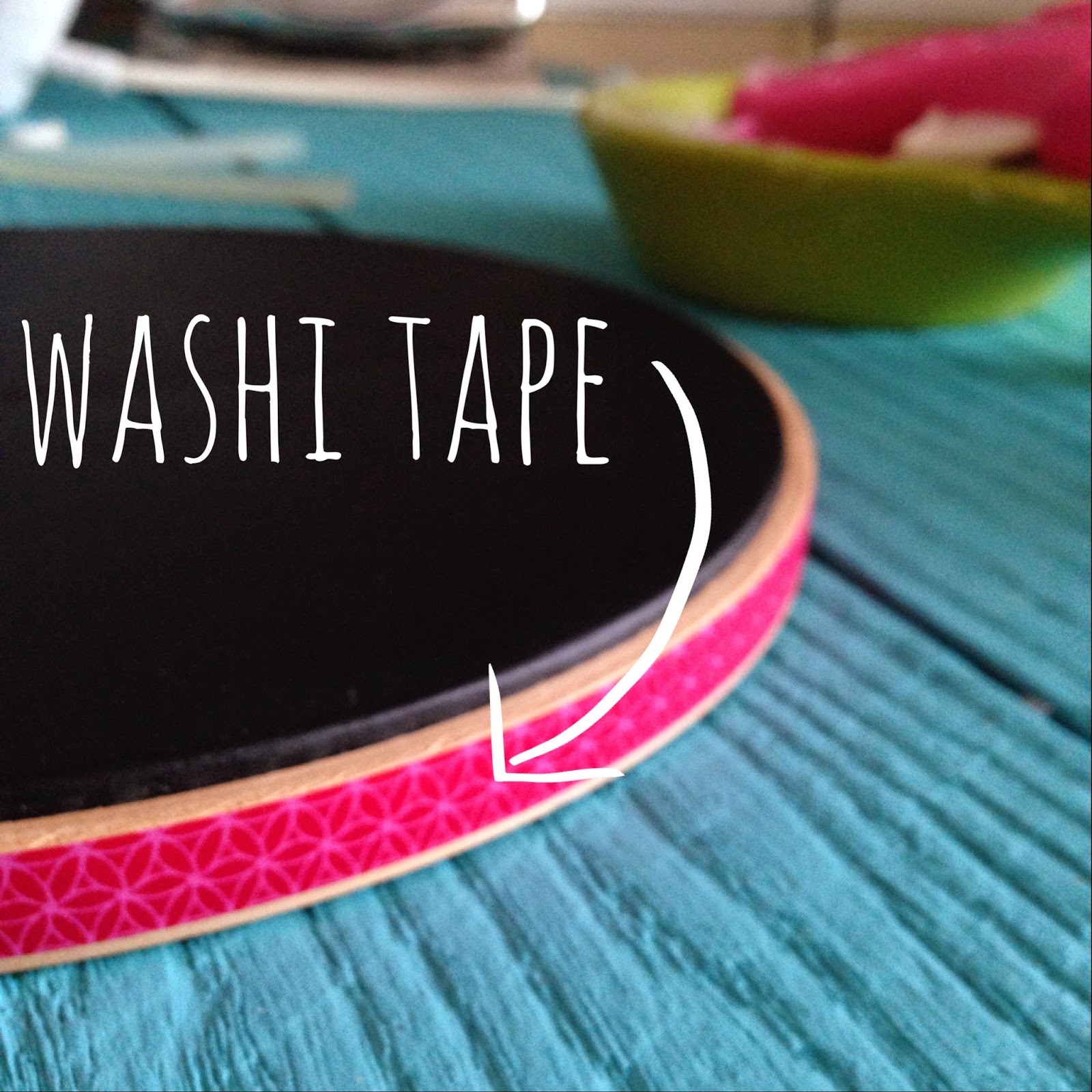 You can embellish these in lots of ways…I added some washi around the edge. You can paint them or add a bow or wrap the hoop before you assemble! Don’t forget to rub down the whole surface with chalk and wipe clean before the first use!