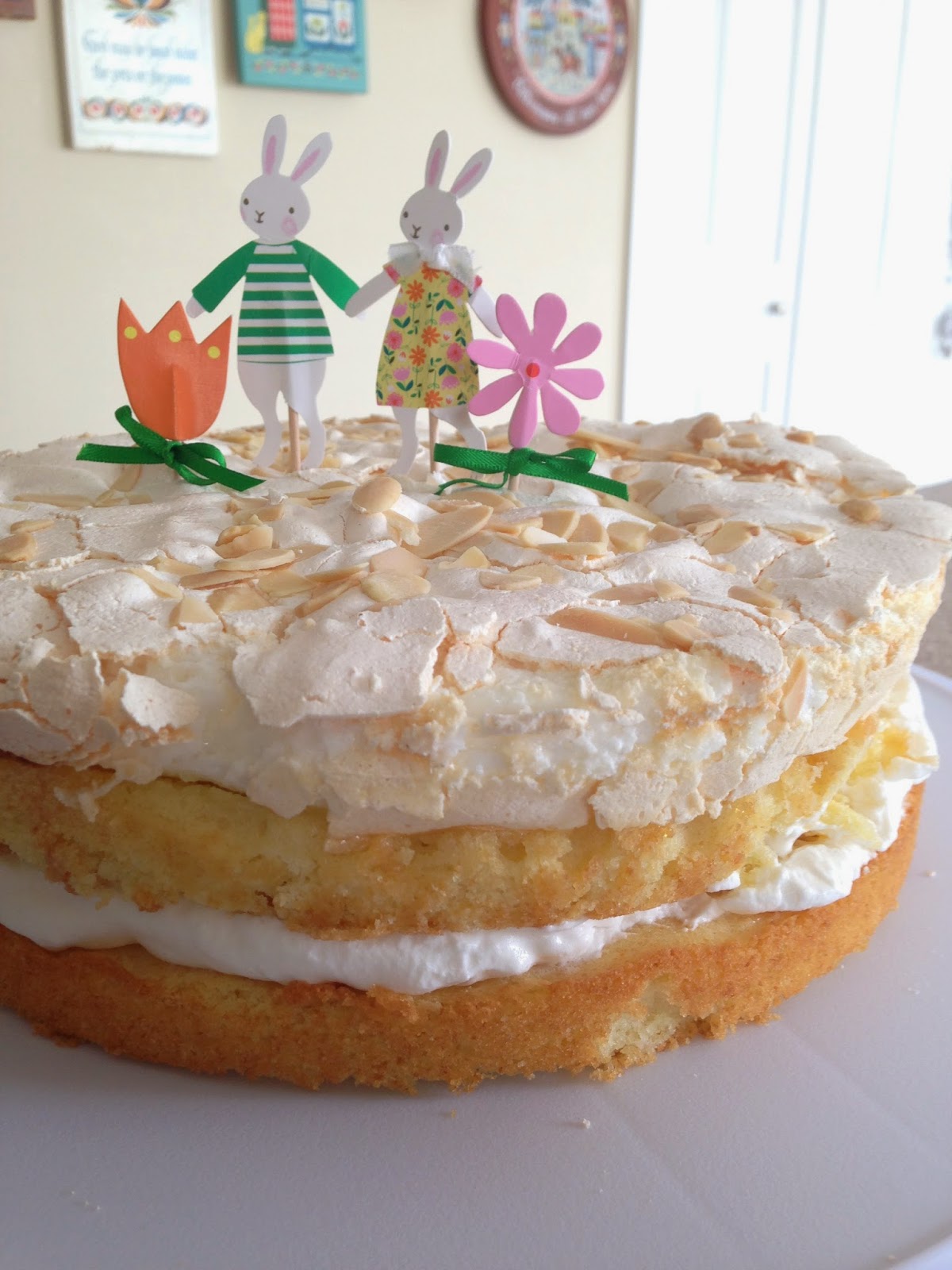 My mother in law sent me this recipe to try sometime, and Easter seemed like just the time. Having never once made meringue in my life, I guess I should have been nervous but it turned out beyond well. This cake was pretty amazing.