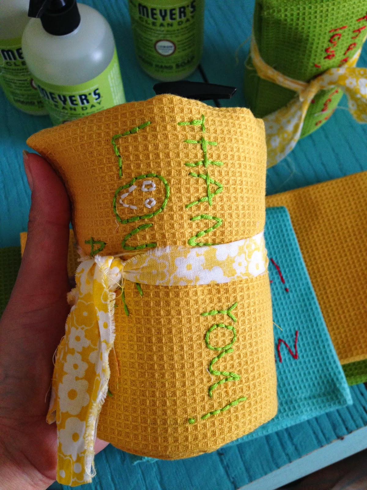 I used the towels to wrap up bottles of hand soap that I got for pennies using ePantry! If you use my referral (www.epantry.com/referrer/5682/) you can get $10 off your first order and then refer others to get $10 in store credit each time! Handsoap comes in handy for teacher and hostess gifts! Sorry for the commercial but it’s worth it to earn FREE cleaning supplies, which you can do with just a couple of successful referrals each month!