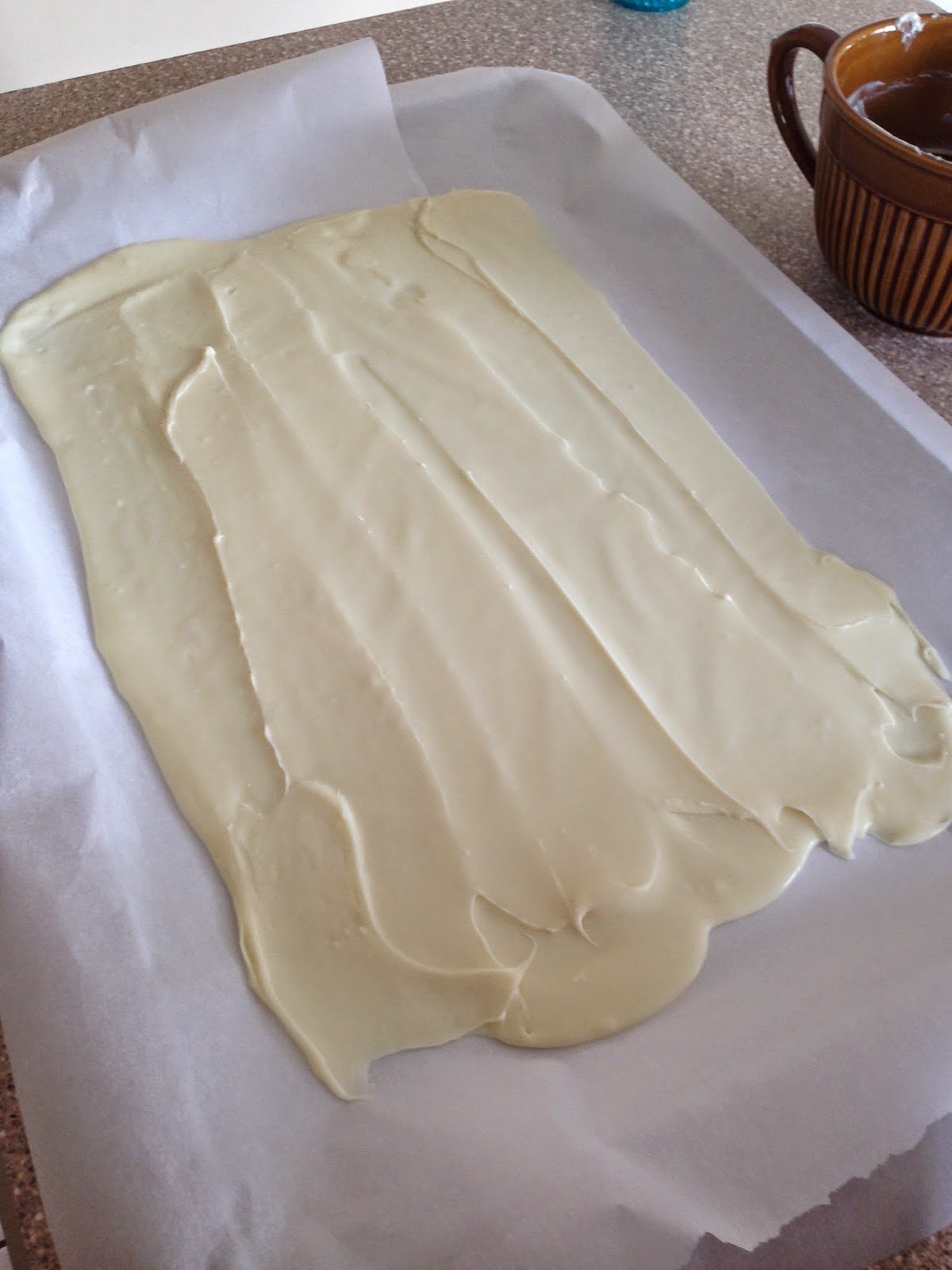 Melt half of the candy as per directions on the package, spread out onto your pan lined with parchment paper. (Regular cookie sheet size)