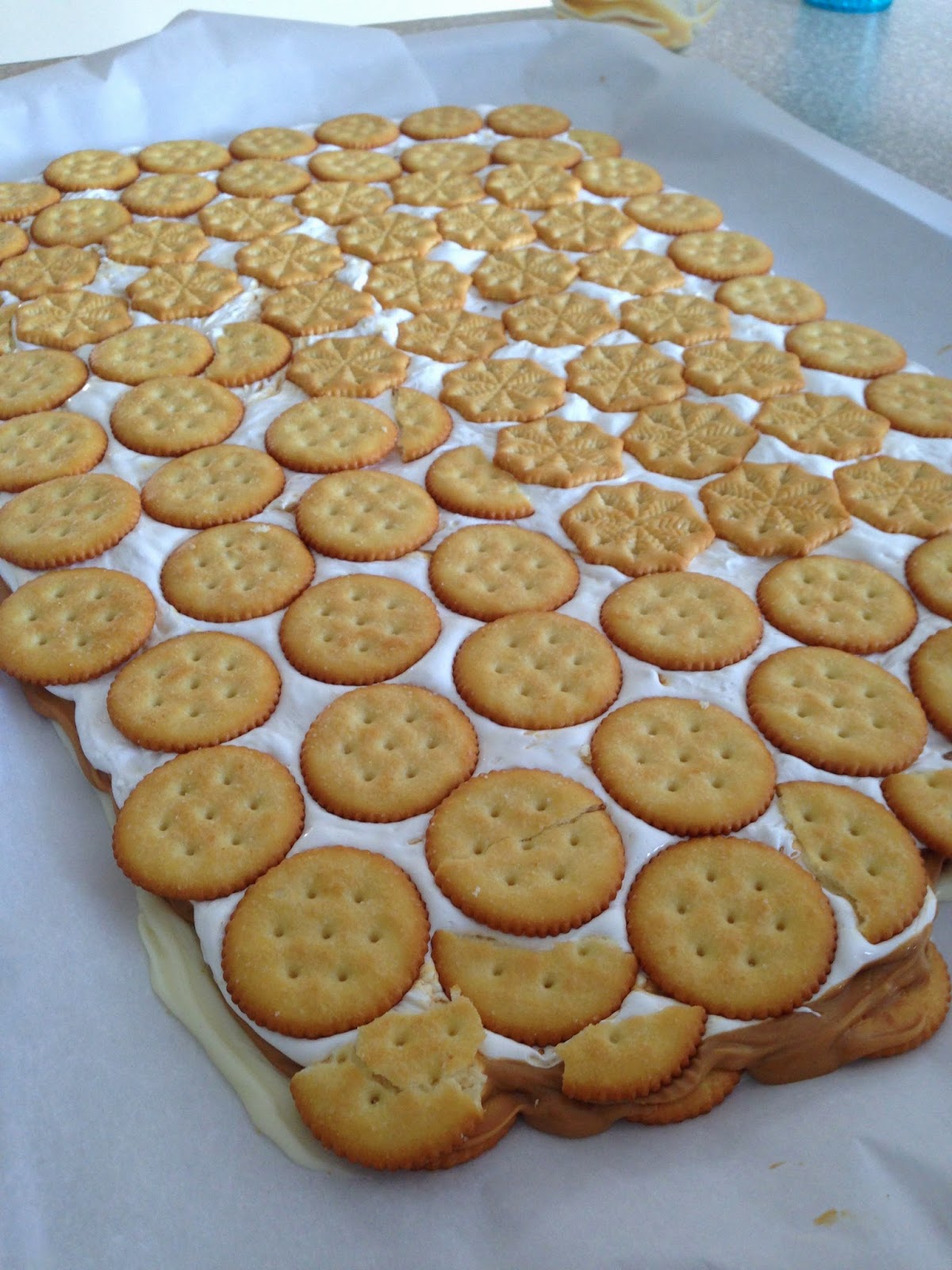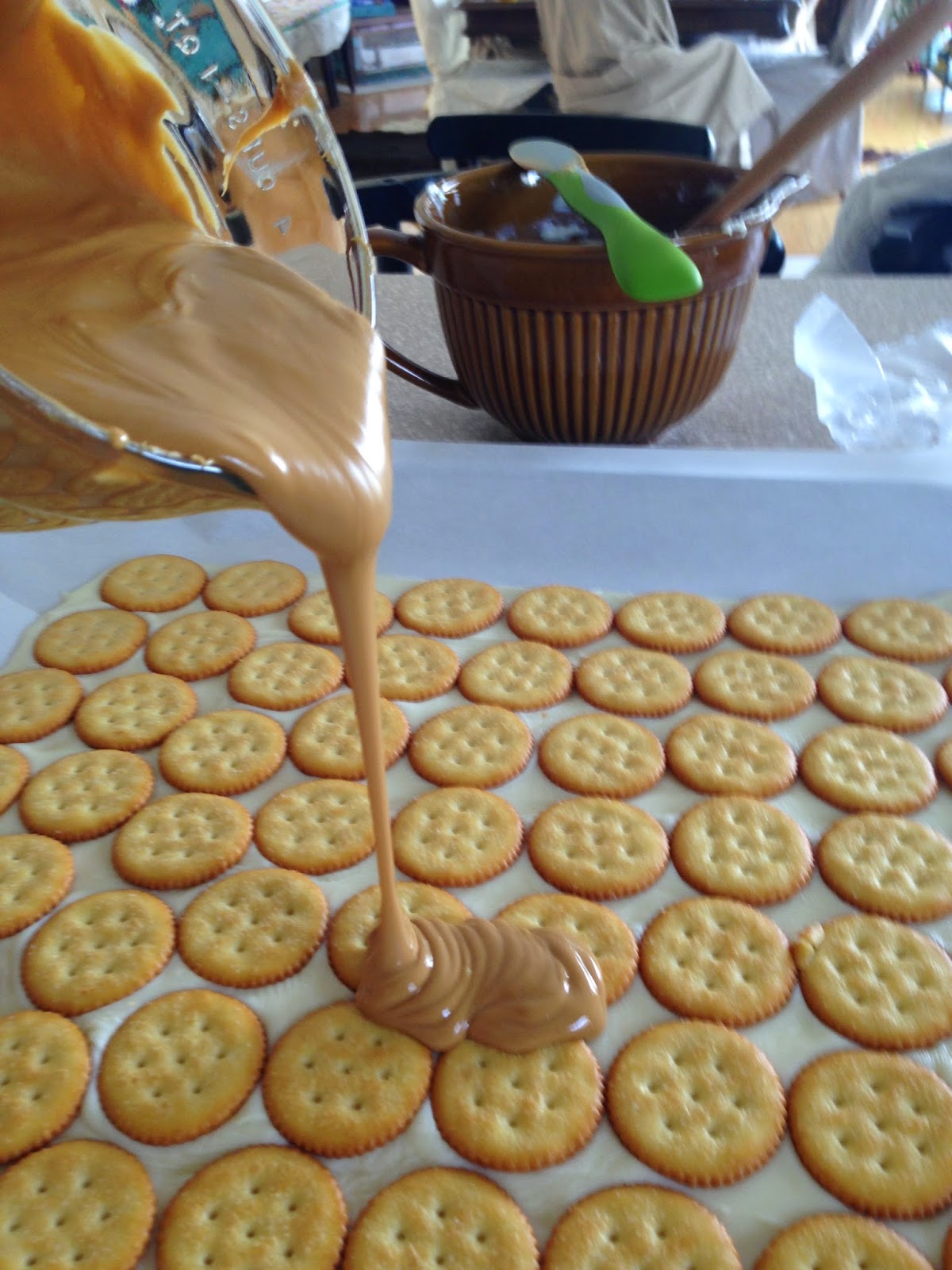 Warm up the peanut butter in a glass dish until pourable, then pour over crackers.