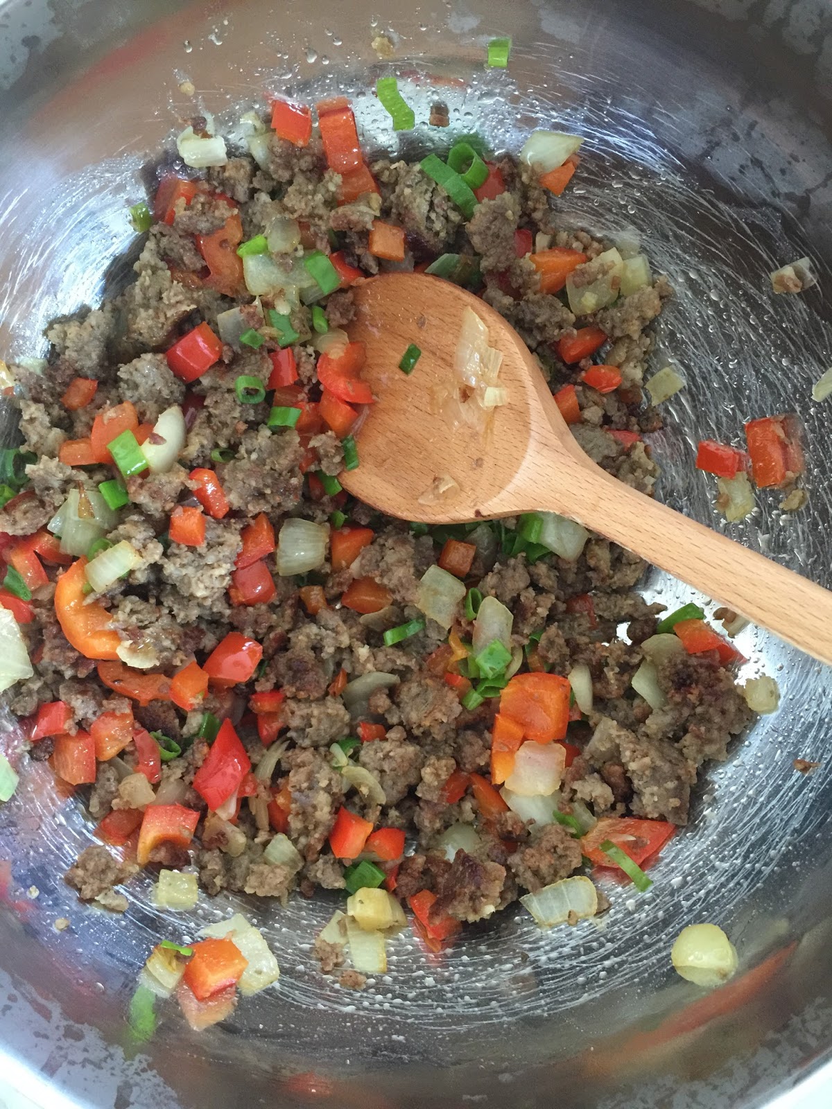 In a large pan, cook the sausage, peppers and onions together until the sausage is done. Drain if needed. Combine this mixture with green onions and two cups of cheese. Add 1/3 cup of this mixture to each tortilla and roll up and place seam side down in a 9 x 13 inch baking dish. Repeat for all.
