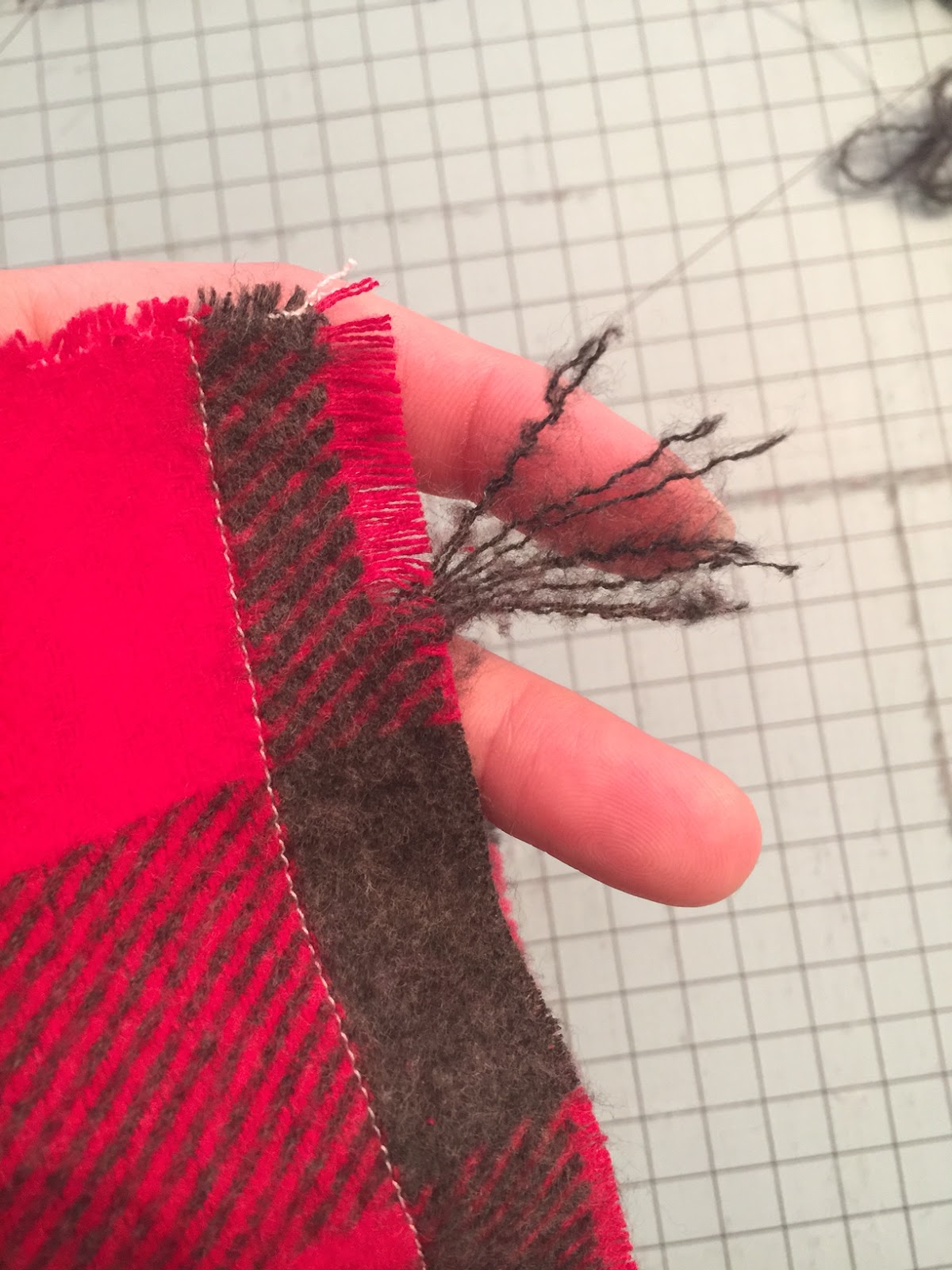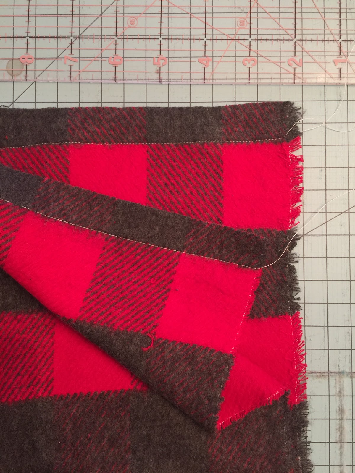Step one: Using the pattern of the flannel as a guide, even up the two raw ends with a rotary cutter or scissors. You won’t have to do anything to the selvedge edges but leave them alone.