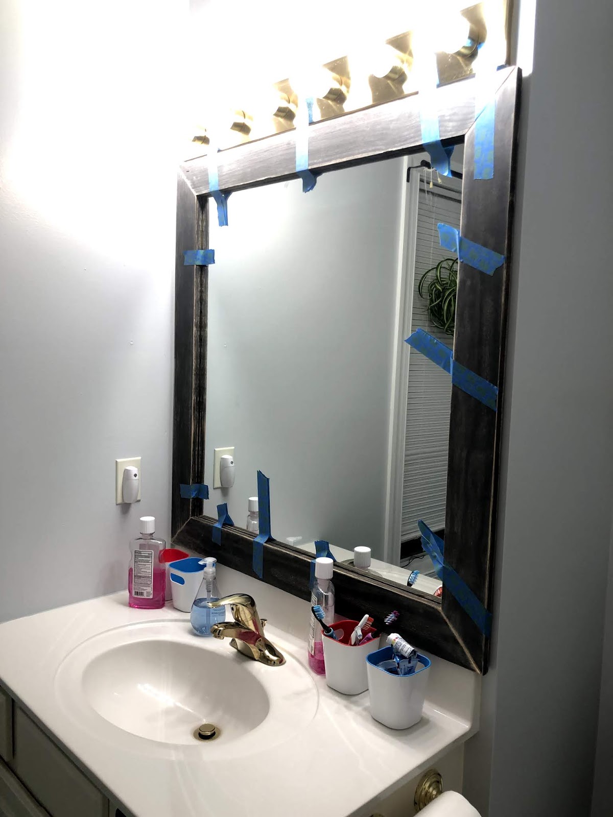 The next board I did was always the wall, then the opposite side and then the top. You can wiggle them around a bit until they fit nicely. Hold them up with the painters tape and allow to dry overnight. Remove tape and feel super accomplished because your mirrors are now cute and NOT standard!
