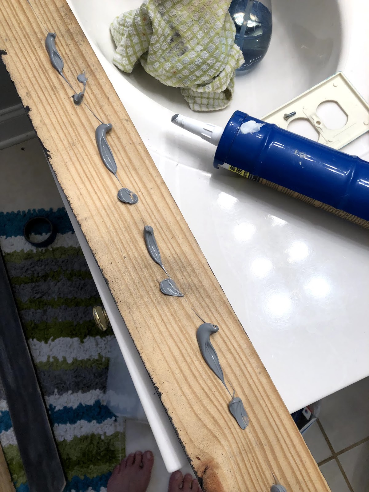 For my frame, I started with the bottom, apply liberal amounts of liquid nails to the center of your board. Don’t get too close to the edge or you may end up seeing it. Apply that board to your CLEAN mirror. Use painting tape to hold in place,