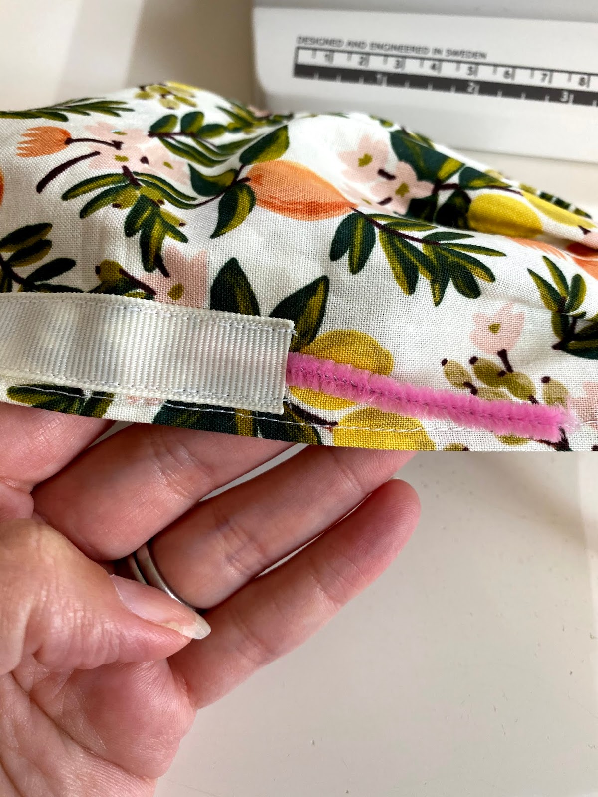 Slip your pipe cleaner into the opening. Remember to remove it when you wash your mask, this is why we only sew down three sides.