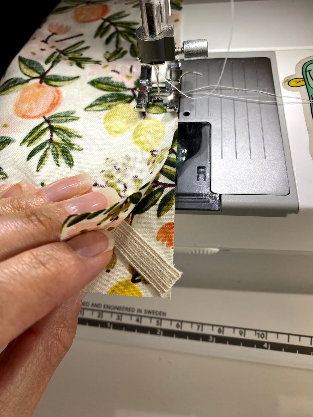I don’t tend to pin things but you can if you’d like. Place the two pieces of fabric right sides together. Pin the ends of elastic into each corner, the shorter 6in sides will be for your ears so each elastic should go from the top to the bottom of each of these sides.